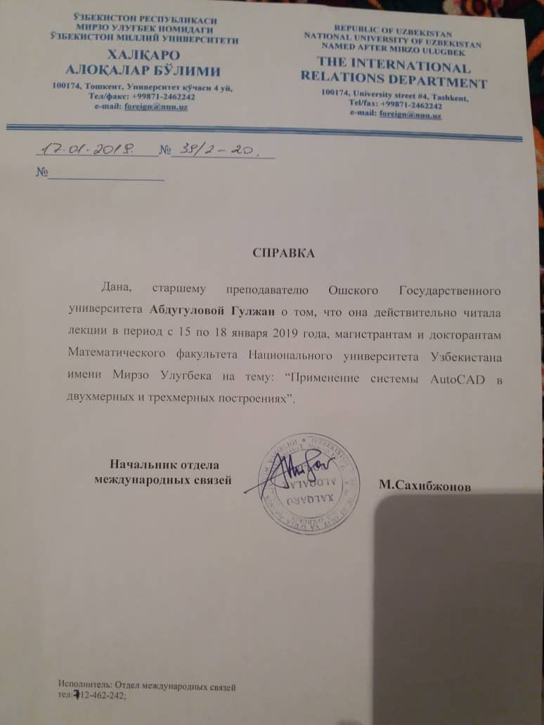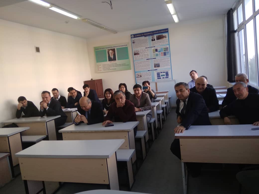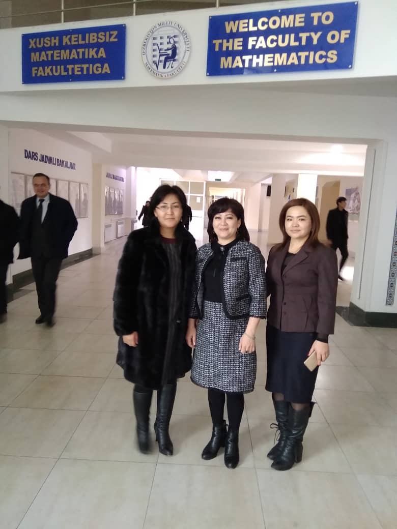 Ош мамлекеттик университетинин бир катар окутуучулары 2019-жылдын 15-18 январга чейин Улук Мирзо атындагы Ташкент улуттук университетинде болуп, тажрыйба алмашып, конок лекцияларды окуп келишти. Сапардын алкагында ф.-м.и.ид., профессор Д.Турсуновдун «Асимптотика решения бисингулярно возмущенных задач» аттуу конок лекциясына аталган университеттин Математика факультетинин академиктери, илимдин докторлору жана кандидаттары катышса, доцент Б.Азимов жана улук окутуучу Г.С.Абдугулованын лекциясына магистранттар катышты. Ошондой эле профессордук-окутуучулук курам, магистрант, студенттер менен пикир алышып, тажрыйба бѳлүшүп, аталган окуу жайдын сертификаттарына ээ болушту. Эки окуу жайдын ортосундагы кызматташтыкты бекемдеген иш-чараны Математика жана информациялык технологиялар факультетинин эл аралык байланыштар боюнча декандын орун басары Гулмира Шамшиева уюштуруп барды.