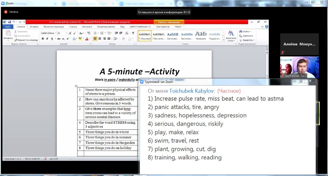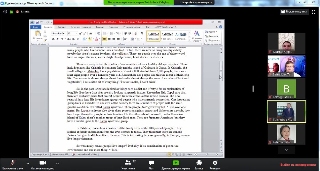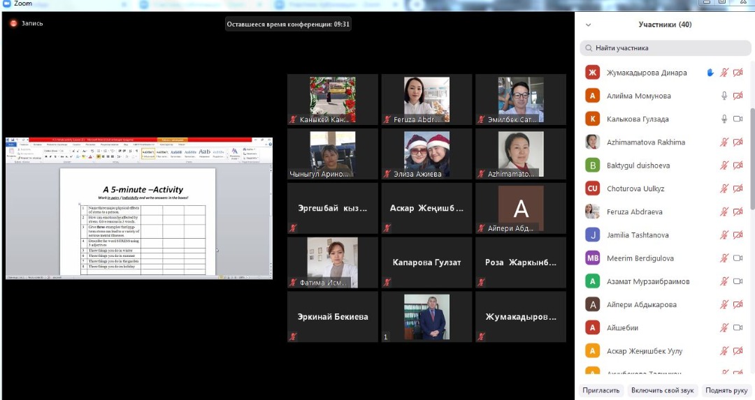 "Максатка жетүү үчүн алдыга жүрүү керек" Оноре де Бальзак. Илим изилдөө багытында "Клиникалык дисциплиналар 1" кафедрасынын окутуучулары, аспиранттар: Ажимаматова Р.М., Темиров Ч.Т., Турдалиев С.О. жана Ымынапазова Н.У. аралыктан Аспирантура бөлүмү тарабынан уюштурулган онлайн сабактарына үзгүлтүксүз катышып, билимдерин өркүндөтүүдө. ОшМУнун Чет тили факультетинин доценти, Тойчубек Кабылов агайдын Zoom платформасы аркылуу уюштурулган кезектеги онлайн сабагынан көз ирмемдер.