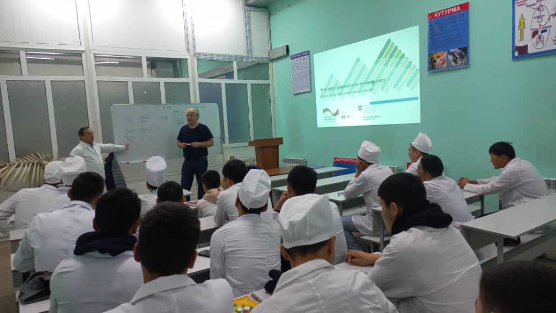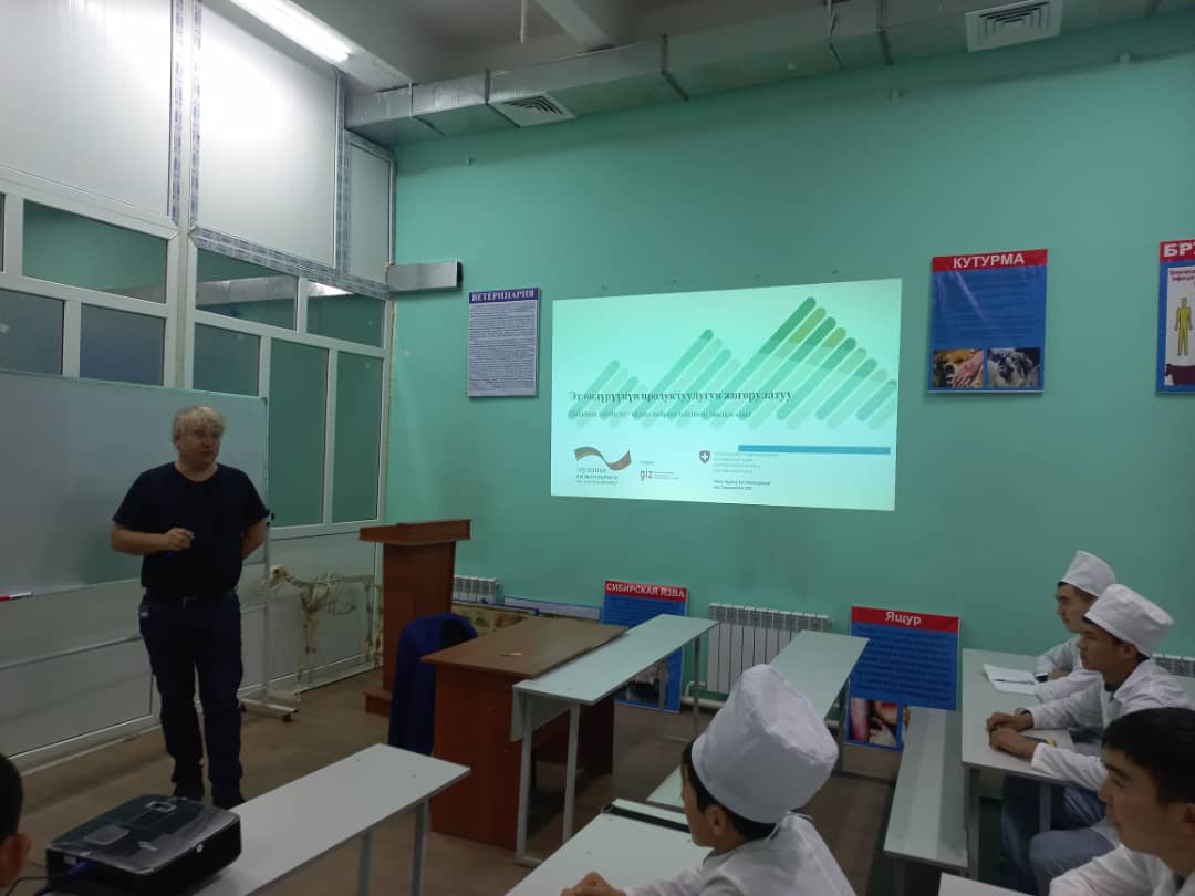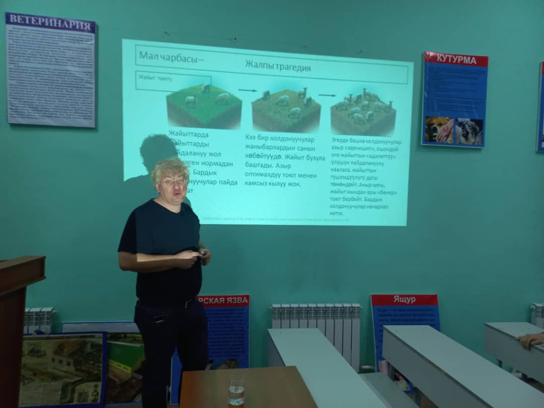 Германиянын GIZ программасынын "Жашыл экономика" проектисинин эл аралык кеңешчи - эксперти Торстен Свобода Ветеринария адистегиндеги студенттерге "Жаныбарларды максаттуу багуунун жана пайдалануунун менеджменти" деген темада лекция өтүп берди. Студенттер сабакта активдүү катышып, өз суроолоруна жооп алышты. Бул конок лекцияны уюштурган директордун илимий иштер боюнча орун басары, б.и.к., доцент А. Н. Халмурзаев.
