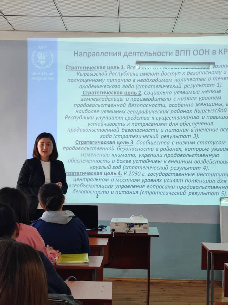 Бегалиева Таттыбубу, выпускница факультета международных отношений, и специалист продовольственной программы ООН по Ошской и Джалал-Абадской областях в данное время, провела гостевую лекцию для студентов кафедры международных отношений на тему "Всемирная продовольственная программа ООН". В ходе встречи были раскрыты цели ВПП ООН и деятельность этой программы в г.Ош. Студенты задавали интересные вопросы, делились фактами.