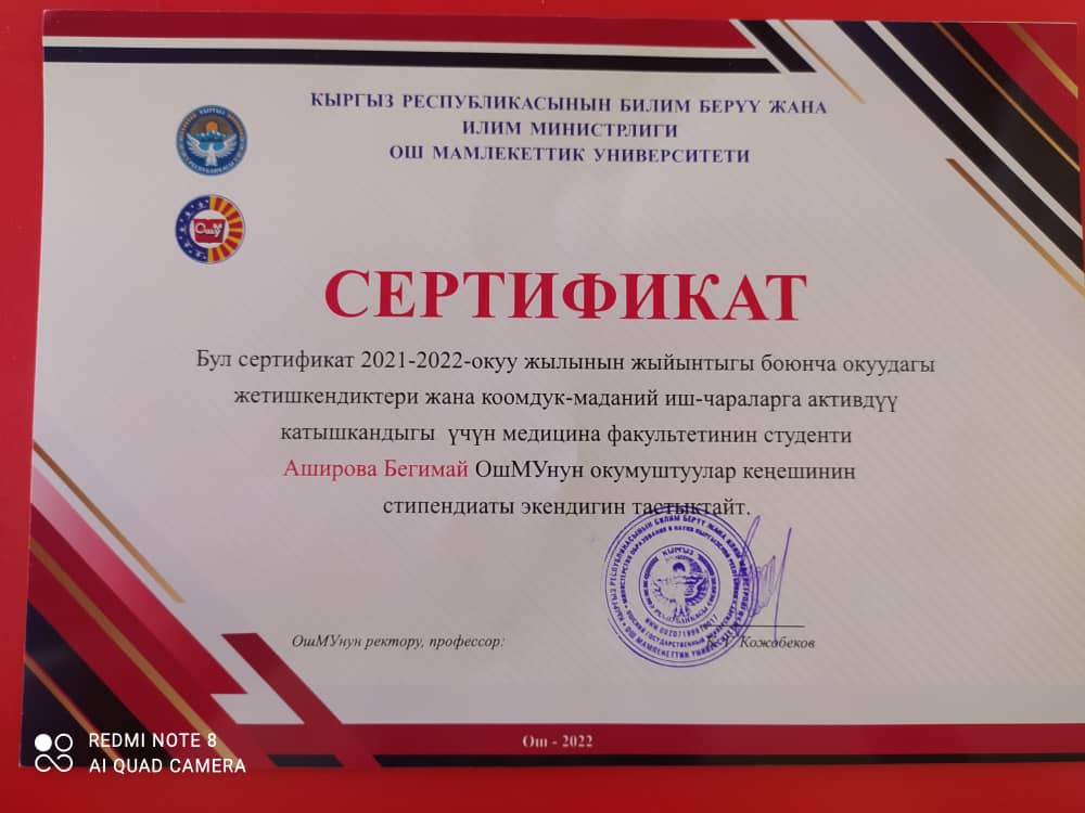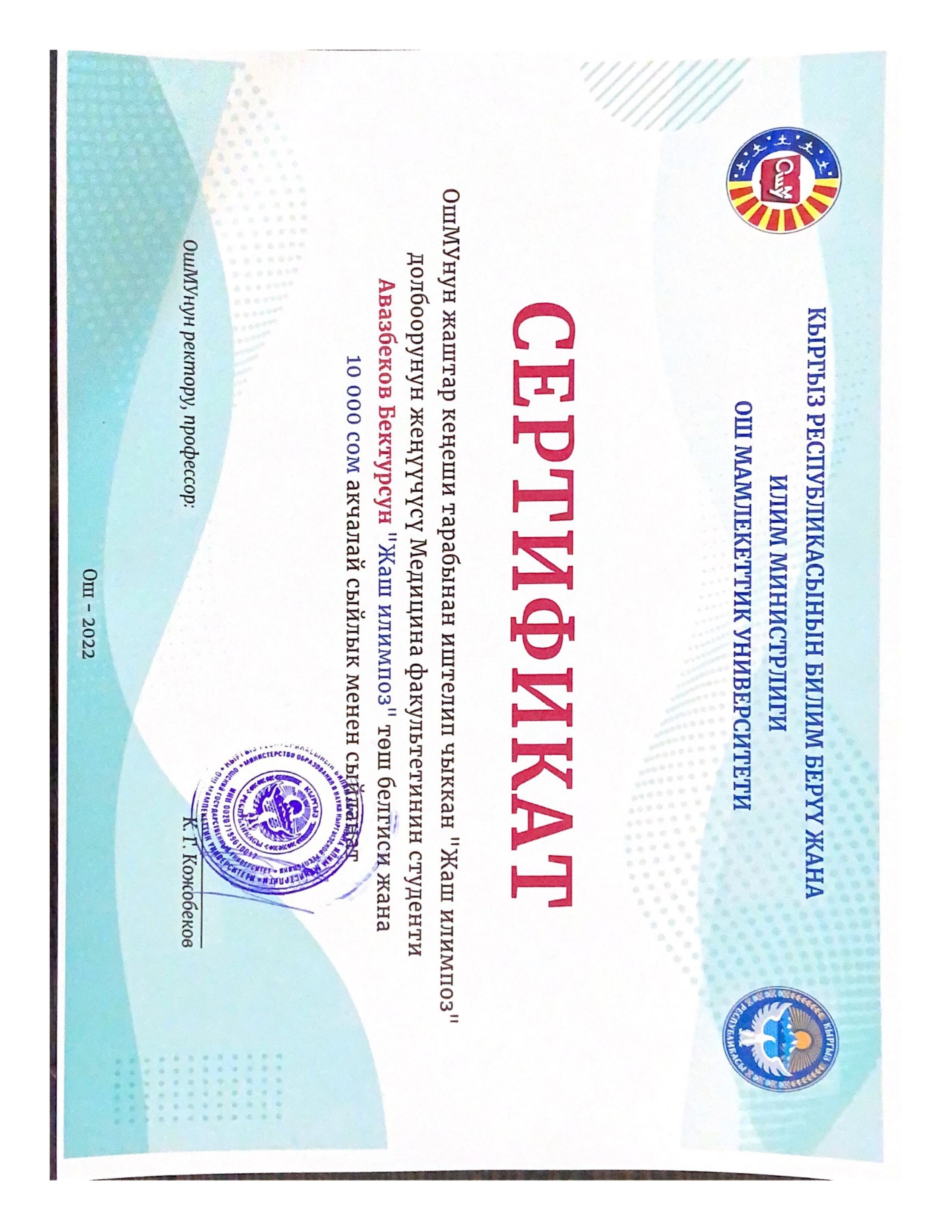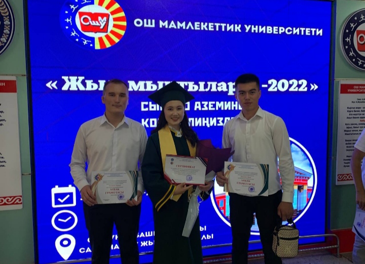 17.06.2022 ж. ОшМУда жылдын мыктылары сыйланды.ОшМУда 2021-2022-окуу жылынын жыйынтыгы менен “Жылдын мыктылары – 2022” сынактарынын жеңүүчүлөрүн сыйлоо аземи болду.Аземде ректор Кудайберди Кожобеков студенттерди куттуктап, жобонун негизинде факультеттерден, колледждерден мыкты деп тандалып алынган 26 студентке ОшМУнун "Окумуштуулар кеңешинин стипендиаты" деген сертификаттарды жана 5000 сомдон акчалай сыйлыктарды тапшырды.Кеченин катышуучуларына концерттик программа тартууланды."Жылдын мыктылары-2022" сыйлоо аземинде медицина факультетинин студенттери Курманбек уулу Эмир, Аширова Бегимай, Маширапова Гулкан ОшМУнун окумуштуулар кеңешинин стипендиясы, Абдуллаев Мурат, Нурбек кызы Айпери, Мойдунова Салтанат жана Топчубаев Торобек ОшМУнун Ардак грамотасы, "Жаш илимпоз-2022" долбоорунун женуучусу Авазбеков Бектурсун "Жаш илимпоз" төш белгиси жана 10 000 мин сом акчалай сыйлык менен сыйланышты.Кеченин катышуучуларына концерттик программа тартууланды.