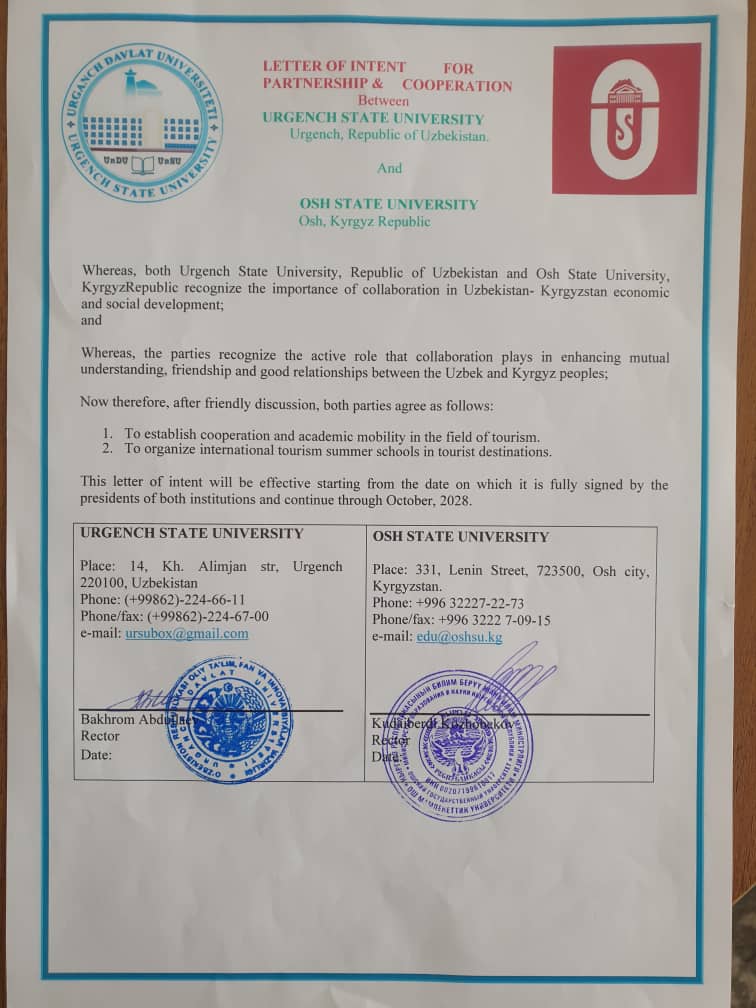 Ушул эле жылдын октябрь айында Ош мамлекеттик университети менен Ургенч мамлекеттик университетинин ректорлорунун 1.Туризм тармагында кызматташтыкты жана академиялык мобилдүүлүктү орнотуу; 2. Туристтик багыттар боюнча эл аралык туристтик жайкы мектептерди уюштуруу ж.б. илимий-изилдөө боюнча келишимине кол коюлган болчу.