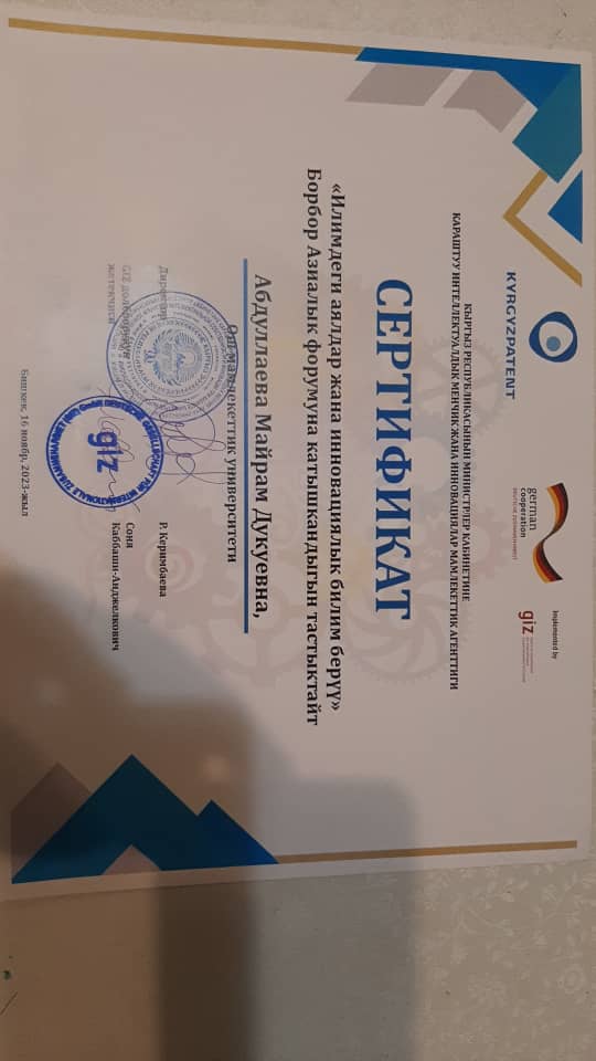 ОшМУнун ТТАТФнин химия жана химиялык технологиялар кафедрасынын профессору Абдуллаева Майрам Дүкүевна 2023-жылдын 16-17-ноябрь күндөрү Бишкек шаарында болгон “Аялдар илимде жана инновациялык билимде” Борбордук Азия форумуна катышып келди. Форумда «Илимдеги аялдар өзгөрүүнүн кыймылдаткыч күчү» аттуу китептин бет ачары болду. М.Д.Абдуллаева “Илимде, ойлоп табуучулукта, инновациядагы аялдардын образы” аттуу конкурстун жеңүүчүсү катары ушул китепке жана Ата мекендик ойлоп табуучулар жана новаторлор клубуна кирген.