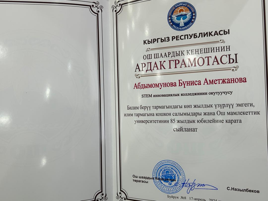 Ош шаардык кеңешинин Ардак грамотасы 12:12 28-05-2024 282 ОшМУнун 85 жылдык мааракесине карата билим берүү тармагындагы көп жылдык үзүрлүү эмгеги, илим тармагына кошкон салымы үчүн кафедрабыздын улук окутуучусу Абдымомунова Буниса Аметжановна Ош шаардык кеңешинин Ардак грамотасы менен сыйланды 2024-05-28 12:12:04 2024-05-28 12:04:05 2024-05-28 12:04:09 282 12:12 28-05-2024