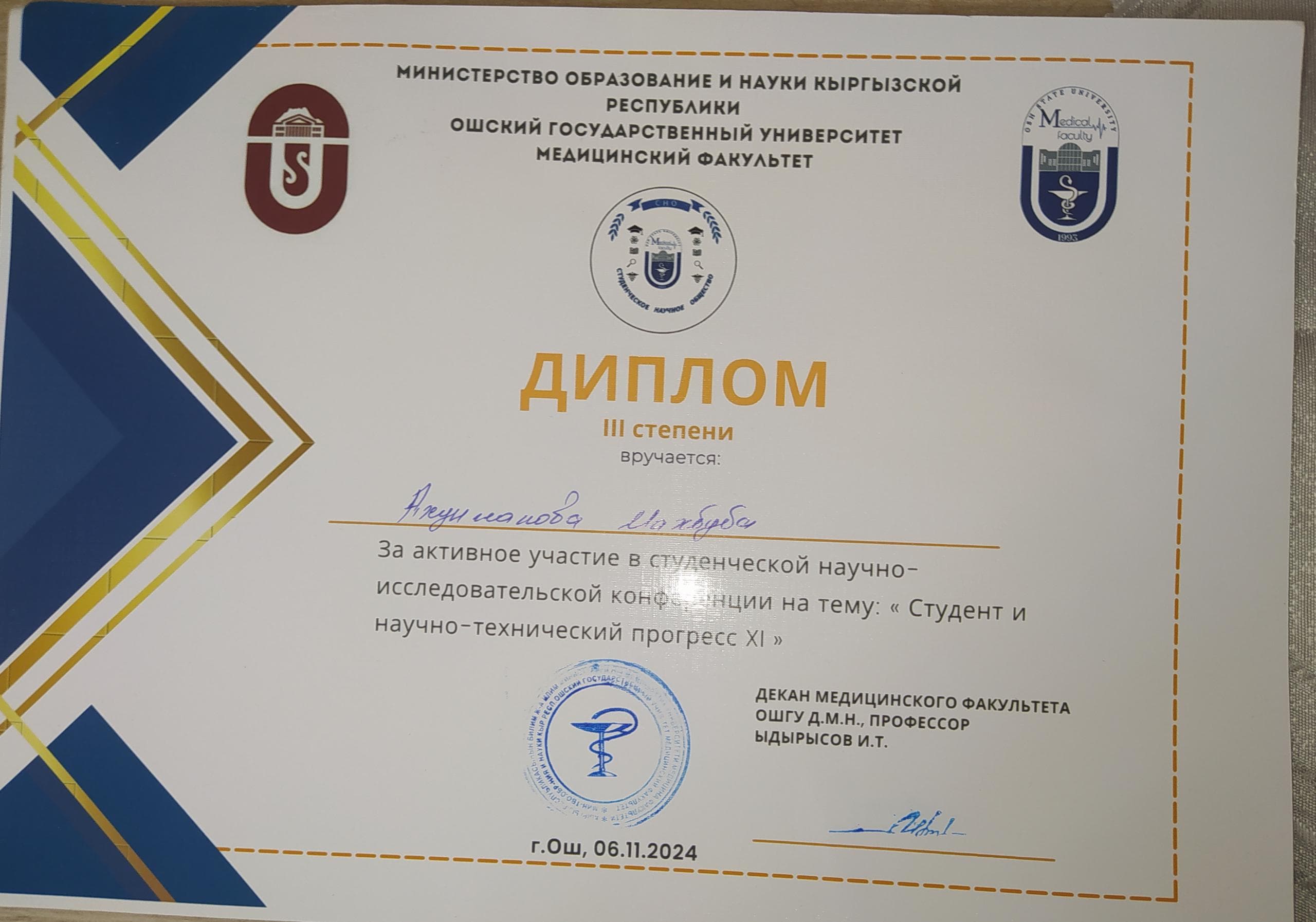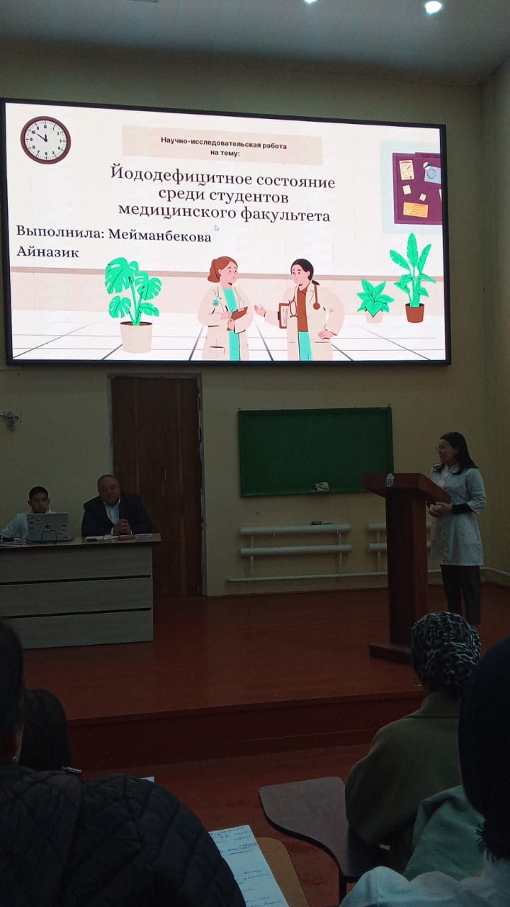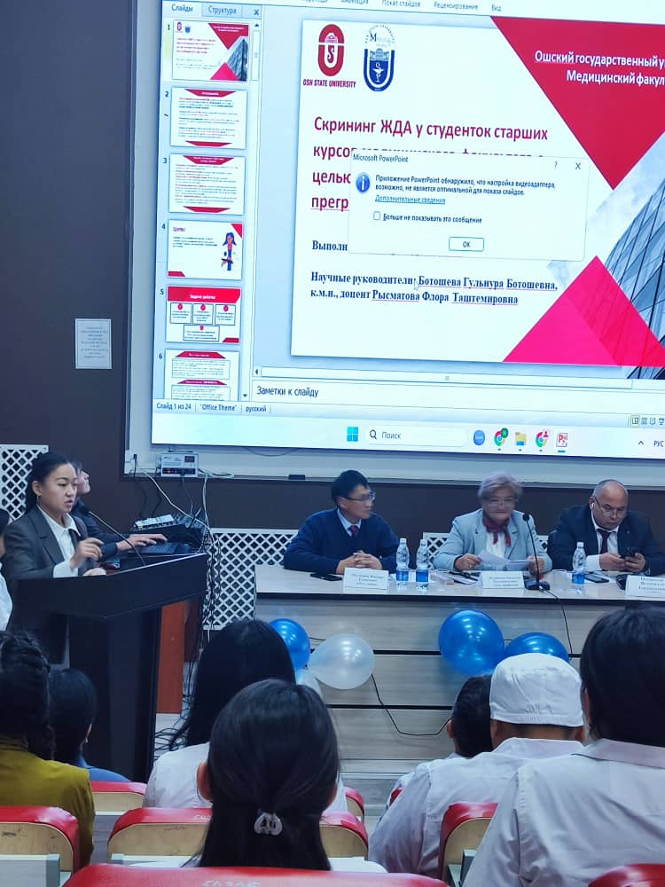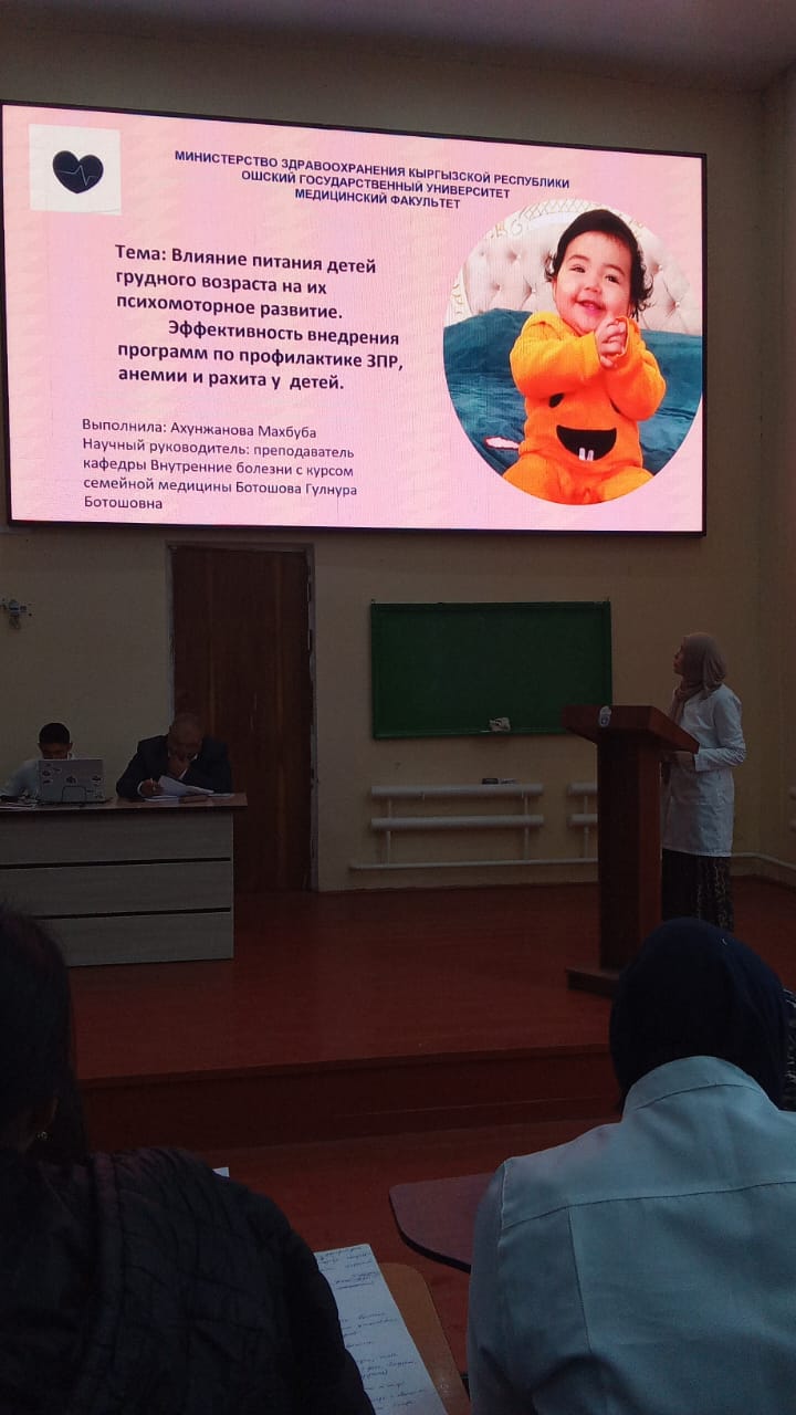 Ош МУ нун медицина факультетинде 06.11.2024 "Студент жана илимий-техникалык прогресс XI" аталыштагы илимий конференцияга ички оорулар уй булолук медицина курсу менен кафедрасынан Ф.Т.Рысматова. А.Алибаева жана