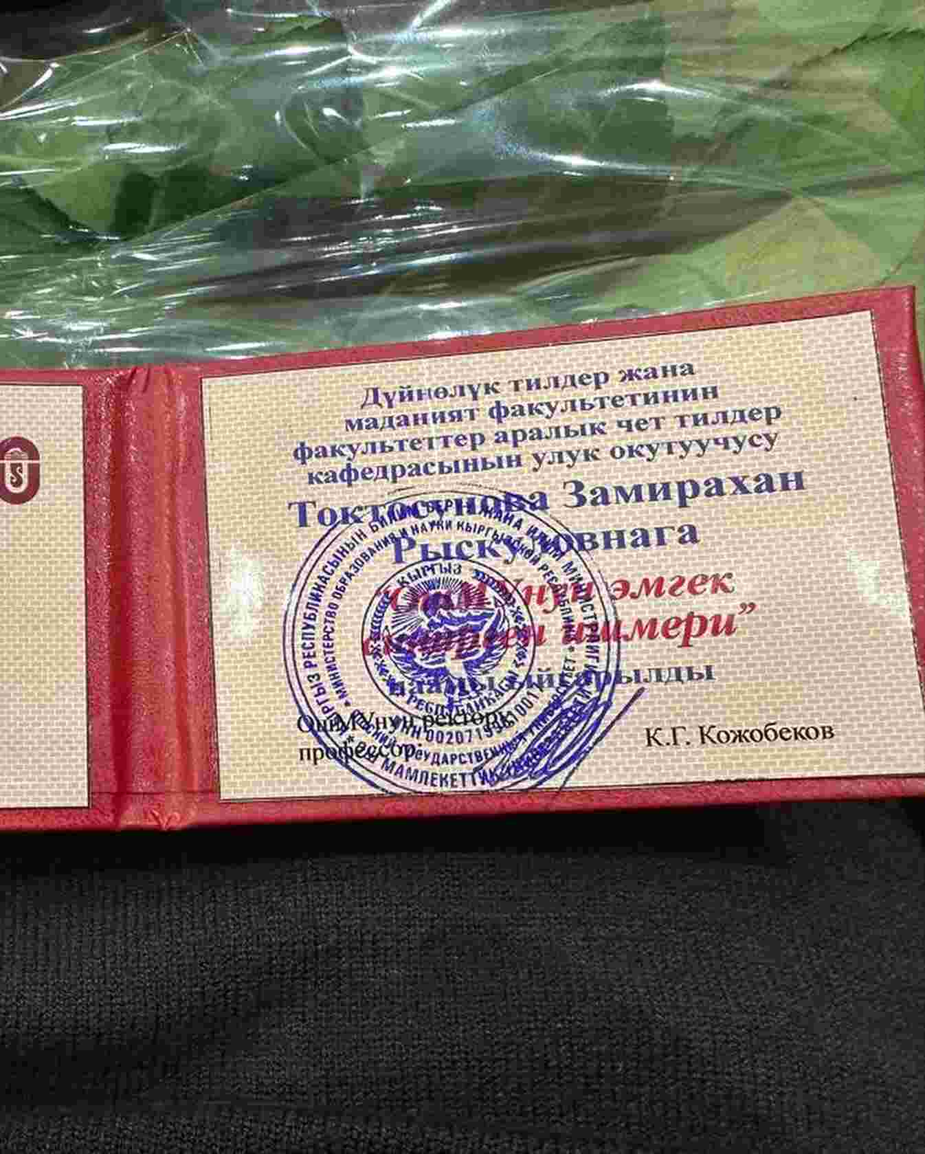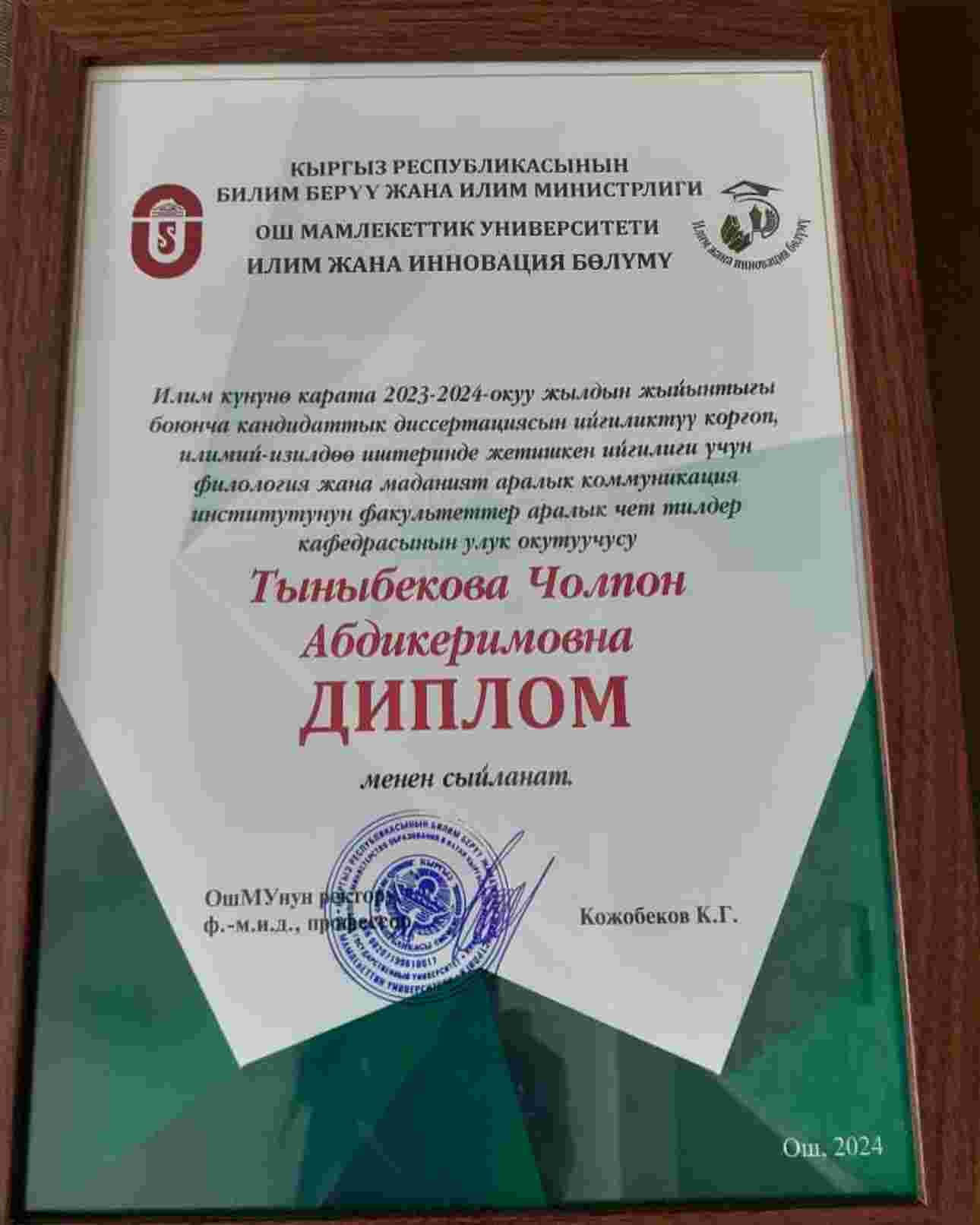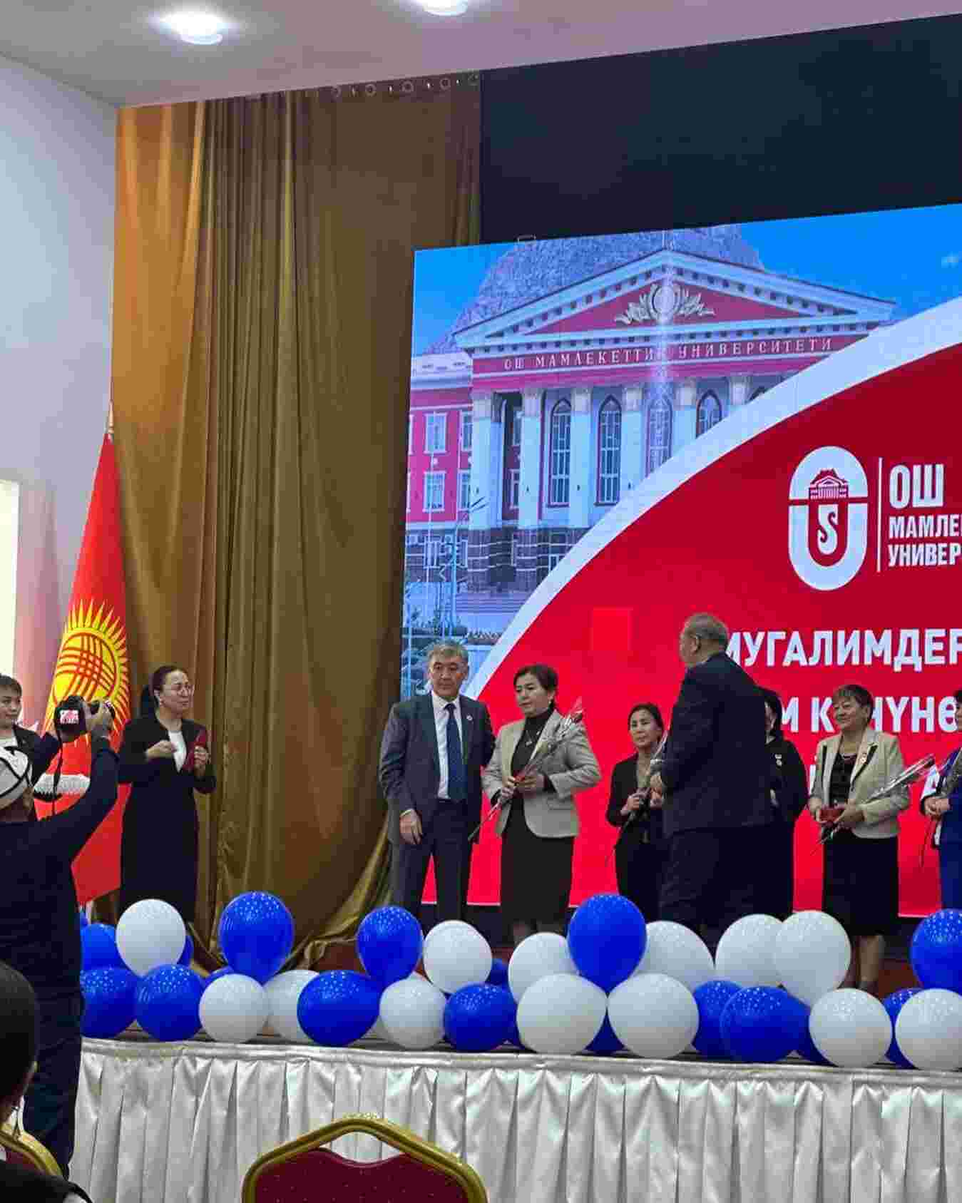 On November 26, 2024, an award ceremony for Teacher and Science Day was held at Osh State University. Senior teachers of the interfaculty department of foreign languages of the Institute of Philology and Interculture Tynybekova Ch. were awarded a diploma for success in scientific work, and Toktosunova Z was awarded with the medal 26.11.2024 ОшМУда мугалимдер жана илим кунуно карата сыйлоо аземи болуп отту. Филология жана маданият аралык институтунун факультеттер аралык чет тилдер кафедрасынын улук окутуучулары Тыныбекова Ч илимий изилдоо ишинде жетишкен ийгилиги учун диплом менен сыйланса, Токтосунова З ОшМУнун эмгек синирген ишмери тош белгиси менен сыйланышты.