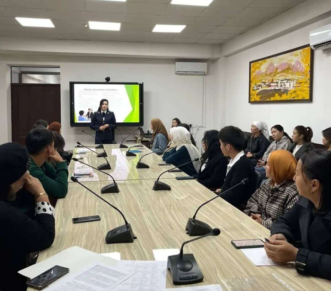 Социалдык иштер жана АЧД циклынын 3 курс студенттерине, Пенитенциардык мекемедеги социалдык иштер сабагынан, Кыргыз Республикасынын Юстиция министрлигинин алдындагы Пробация департаментинин Ош жана Баткен облустары боюнча аймак аралык башкармалыгынын Алай району боюнча пробация органынын башкы адиси Сатимаматова Сүйүмкан Сатимаматовна конок лекцияга келип, лекция отуп беришти.