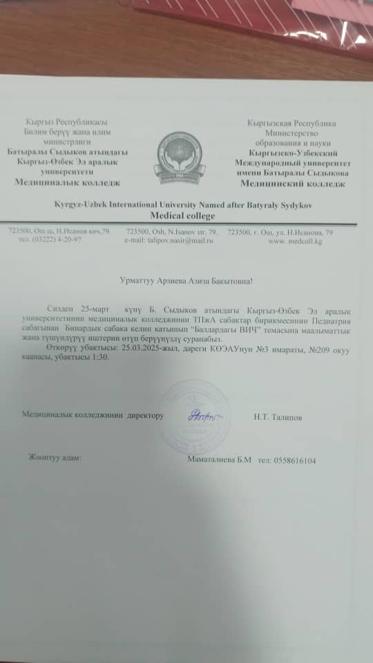 25.03.2025-жылы Б.Сыдыков атындагы Кыргыз-Өзбек Эл аралык университетинин медициналык колледжинин Терапия жана акушерство сабактар бирикмексинде Педиатрия сабагынан “Балдардагы ВИЧ” аттуу темасында Б. Маматалиева тарабынан бинардык сабак уюштурулуп, ага Фармацевтикалык дисциплиналар ПЦКсынын окутуучусу А. Арзиева фармаколдогия предметинен тышкы мобилдүүлүк боюнча катышты. Бинардык сабакта педиатрия, фармакология, акушерство предметтер аралык байланыштары аркылуу айкалыштырылып, аталган адистиктерден ар кайсы колледждерден келген окутуучулар катышты жана билимдери менен бөлүшүштү.