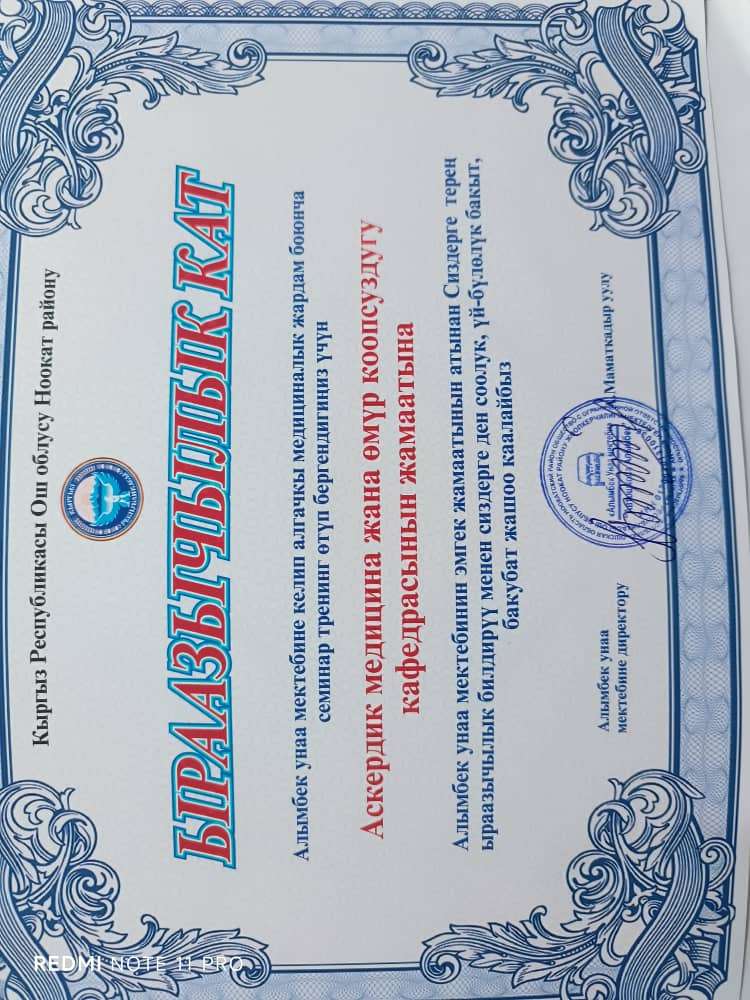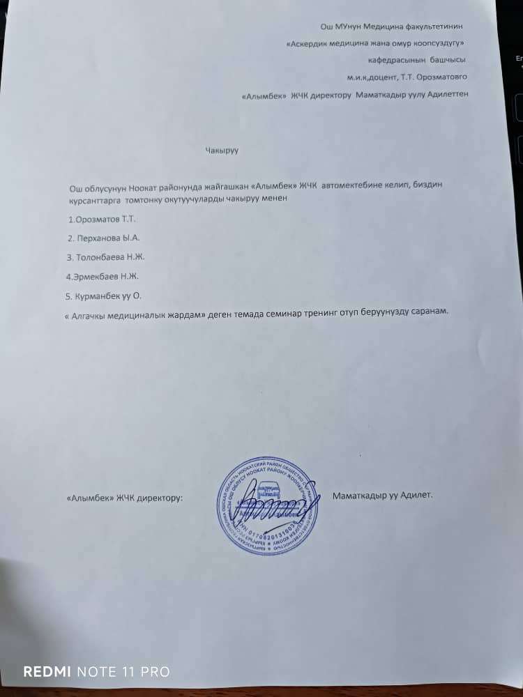 Ош облусунун Ноокат районундагы "Алымбек" ЖЧК унаа мектебине барып, ДТП учурунда "Алгачкы медициналык жардам" деген темада семинар тренинг өтүлдү. Бул тренингди ЖЧК "Алымбек" унаа мектебинин директору, Маматкадыр у Адилеттин чакыруусу менен "Аскердик медициналык даярдоо жана өмүр коопсуздугу" кафедрасынын башчысы м.и.к, доцент Т.Т.Орозматов жана кафедранын окутуучулары, улук окутуучу Ы.А Перханова, окутуучулар А.Ж.Төлөнбаева, Н.Ж.Эрмекбаев, Курманбек у Ө өтүштү. Семинардын сонуда унаа мектеинин жетекчилиги тарабынан окутуучулар ыраазычылык кат менен сыйланды.