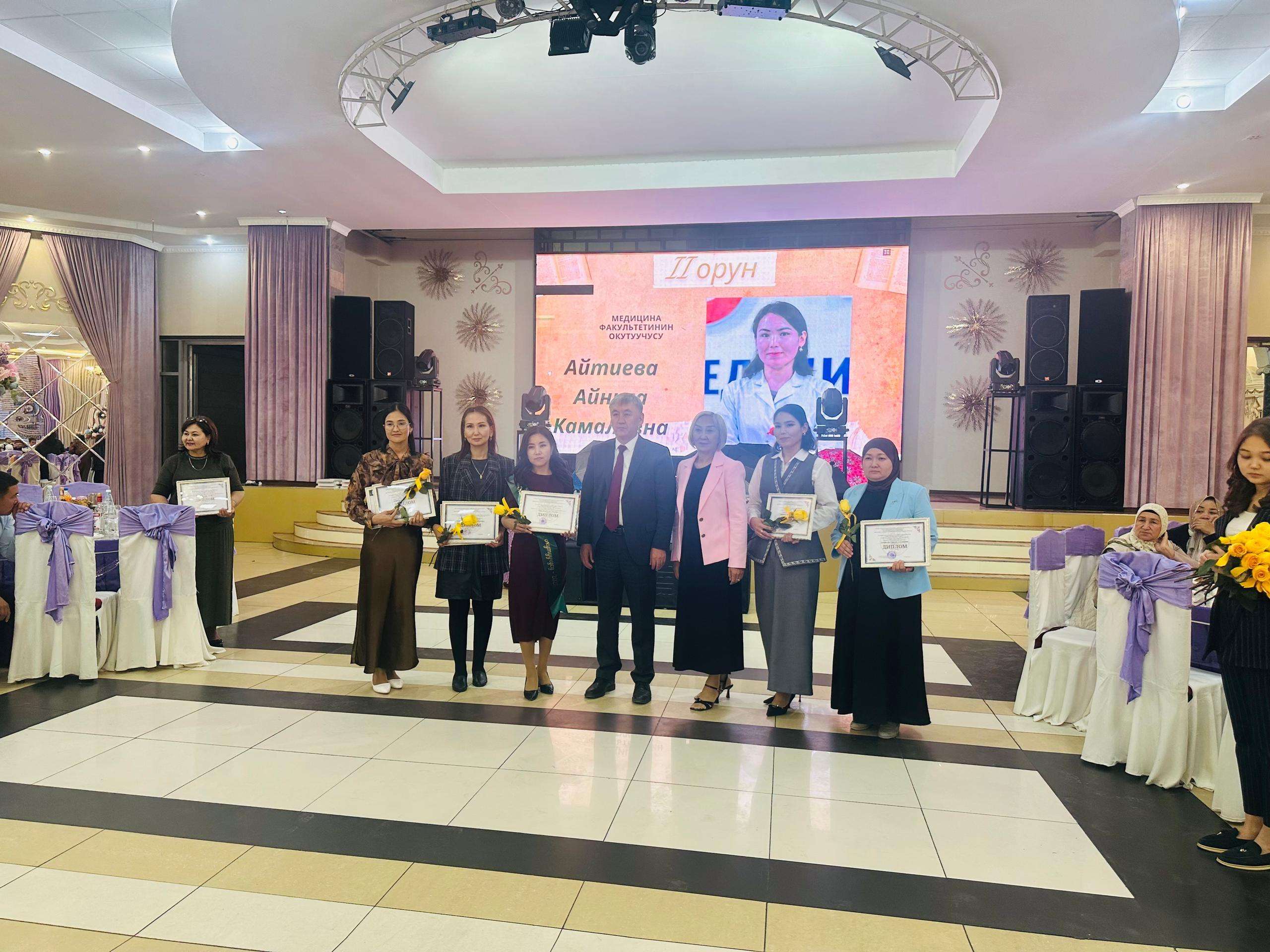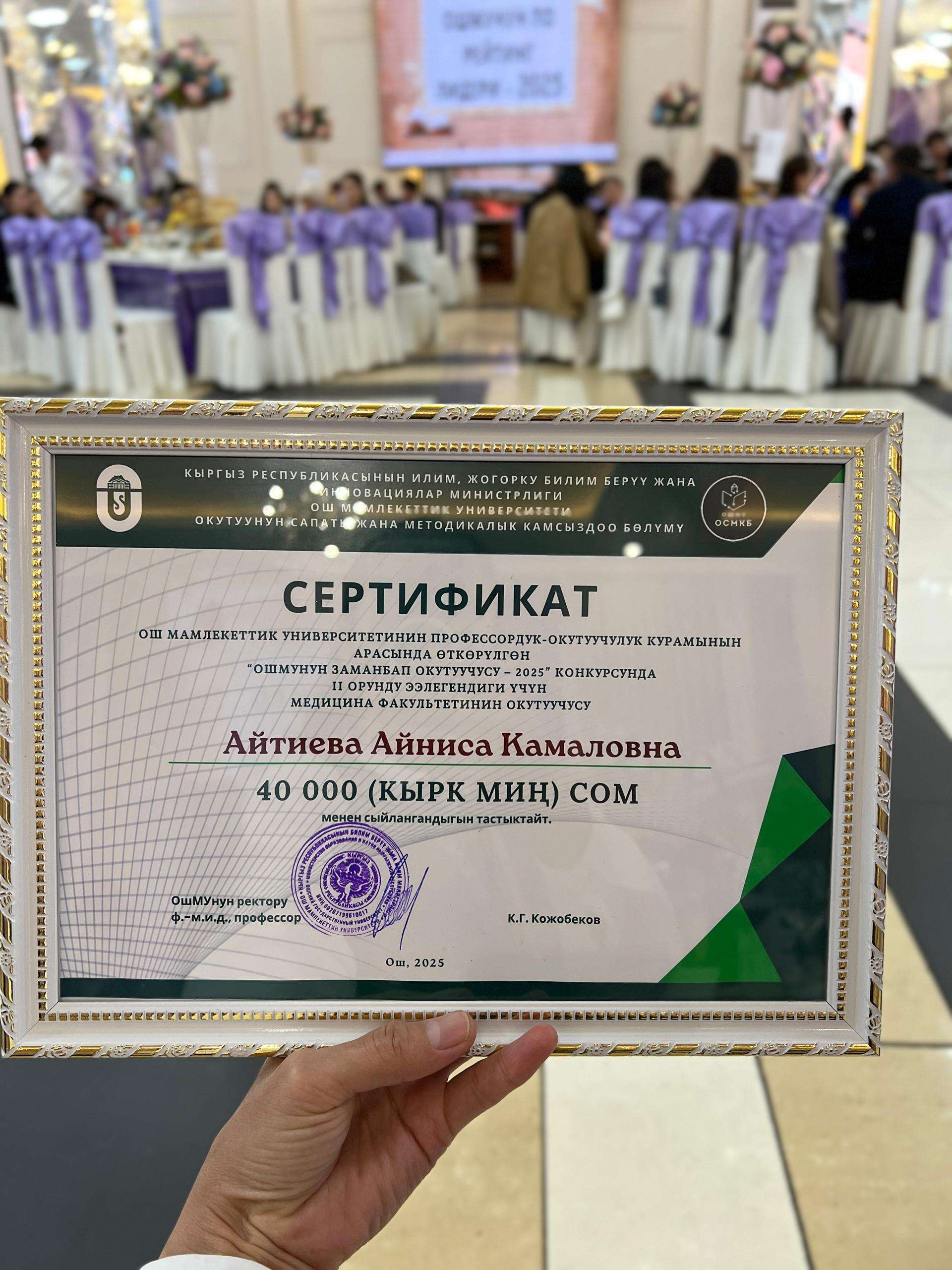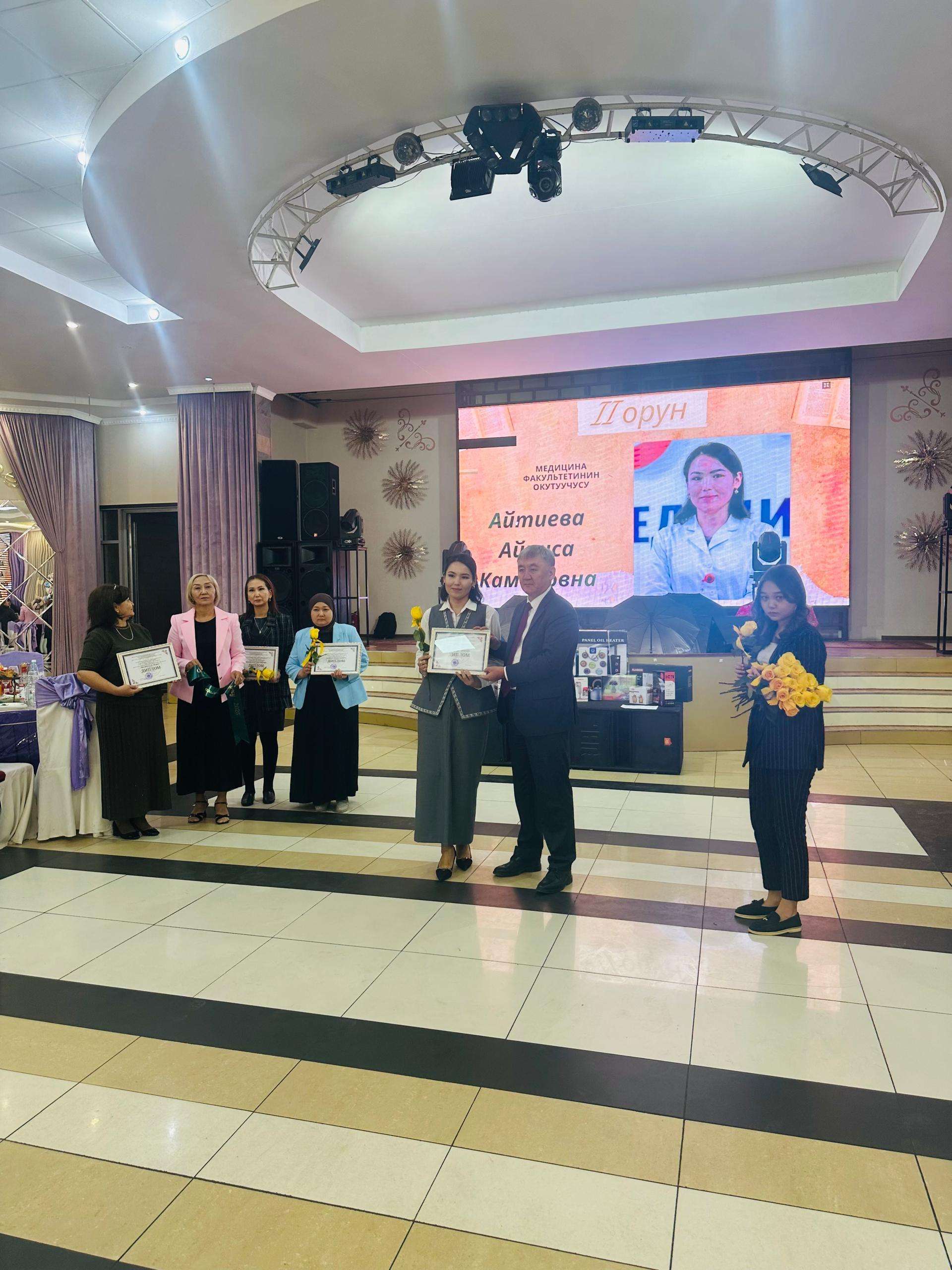 5-октябрь мугалимдер күнүнө карата ОшМУнун окутуучуларына атайын майрамдык маареке өткөрүлдү. Иш чарада госпиталдык терапия кафедрасынын окутуучусу Айтиева Айниса Камаловна “ОшМУнун заманбап окутуучусу-2025” конкурсунда II орунду ээлегендиги үчүн диплом жана 40000(кырк миң) сом менен сыйланды.