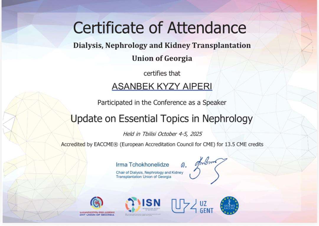Октябрь,2025.Преподаватель кафедры "Общественное здравоохранение с курсом доказательной медицины", PhD докторант Института науки (г. Токио) Асанбек кызы Айпери приняла участие в международной конференции «Update on Essential Topics in Nephrology. ISN NIS & Russia Region Conference», которая прошла в Тбилиси, Грузия.