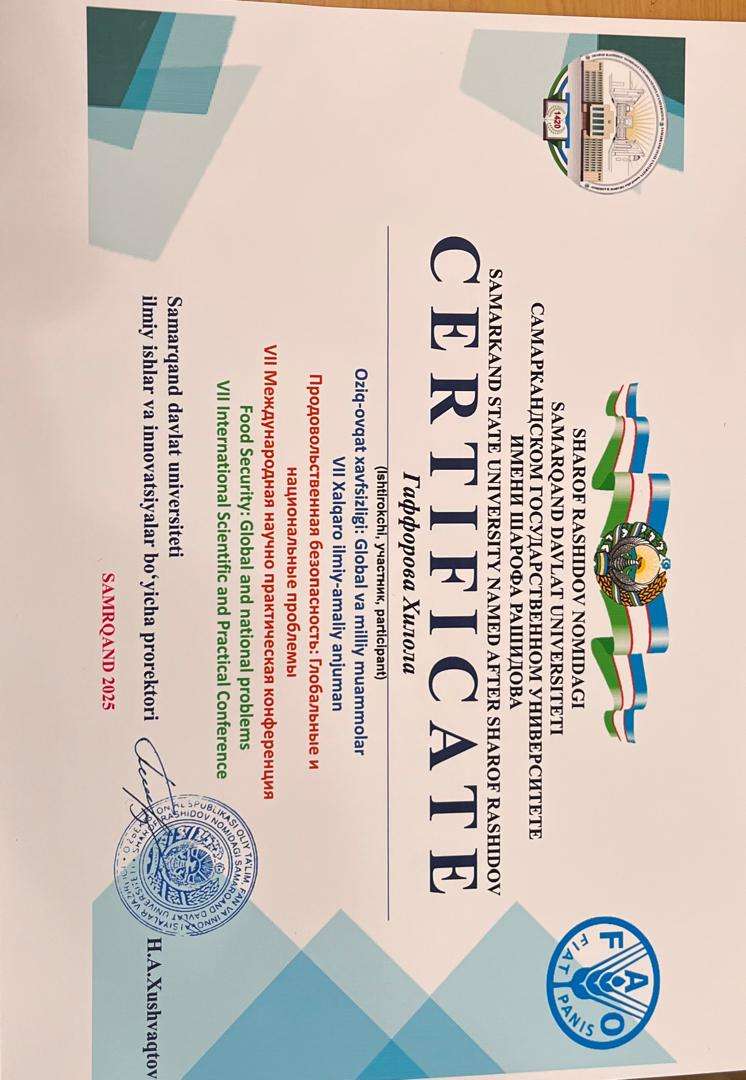 2025-жылдын 14–15-октябрында Ш. Рашидов атындагы Самарканд мамлекеттик университетинде Өзбекстан Республикасынын Жогорку билим берүү, илим жана инновациялар министрлиги, Бириккен Улуттар Уюмунун Азык-түлүк жана айыл чарба уюмунун (ФАО) Өзбекстандагы өкүлчүлүгү, АКШнын Гарвард университетинин Медициналык колледжи, Россиянын Алтай мамлекеттик университети, Пакистандын Куэйд-и-Азам университети, Россиянын Уфа илим жана технология университети, Россиянын Санкт-Петербург политехникалык университетинин Биомедициналык системалар жана биотехнологиялар институту, ошондой эле Казакстандын Л.Н. Гумилев атындагы Евразия улуттук университетинин Клеткалык биология жана биотехнология институту менен биргеликте «Продовольственная безопасность: глобальные и национальные проблемы (Food Security: Global and National Problems)» аттуу VI Эл аралык илимий-практикалык конференция болуп өттү.