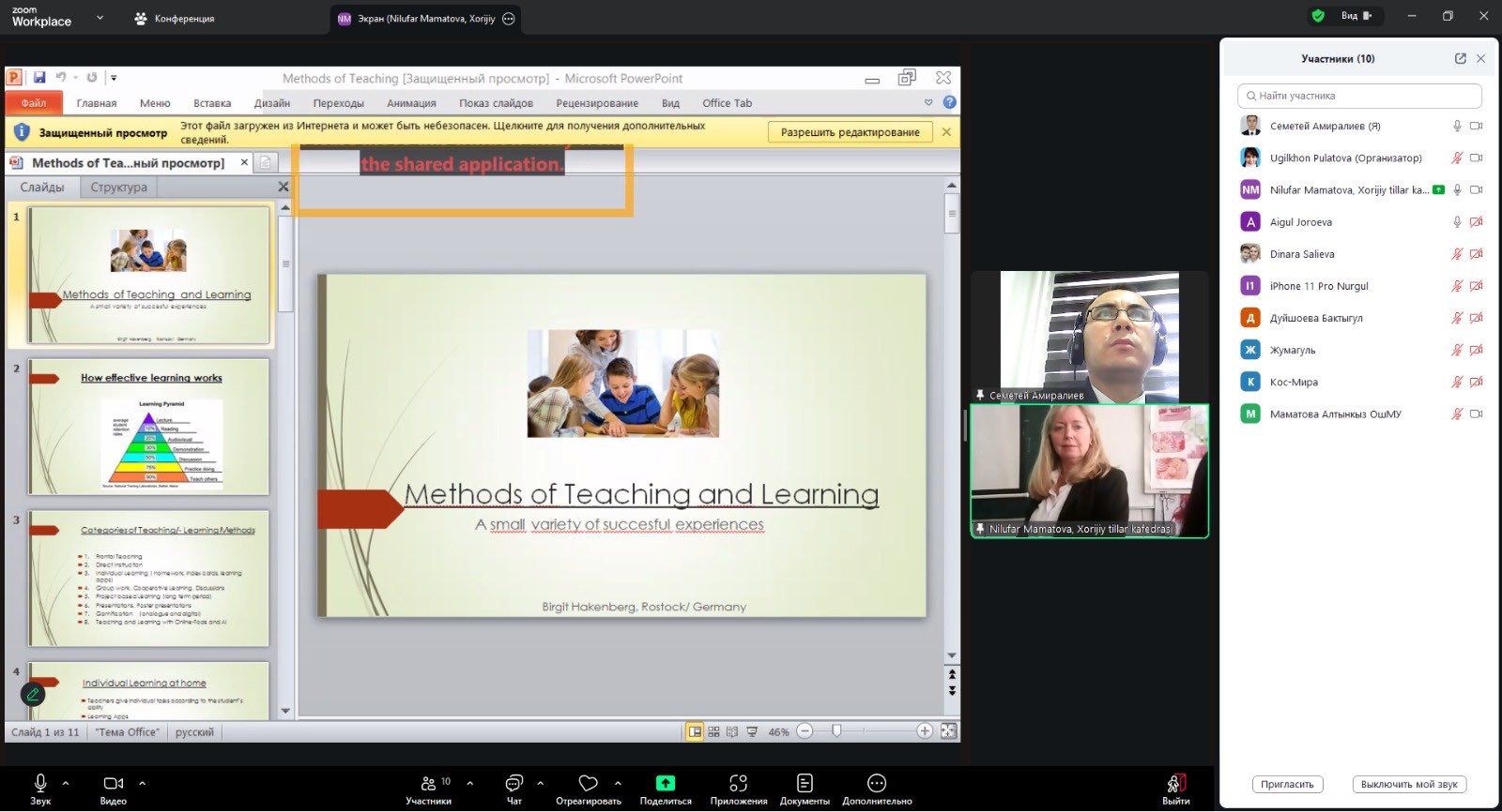 Германиянын Росток шаарында эмгектенген, учурда Андижан мамлекеттик медициналык институтунда иш сапарда жүргөн мугалим Биргит Хакенберг социалдык-гуманитардык дисциплиналар кафедрасынын окутуучуларына “Окутуунун жана үйрөнүүнүн ыкмалары” деген темада методикалык онлайн семинар өтүп берди.
