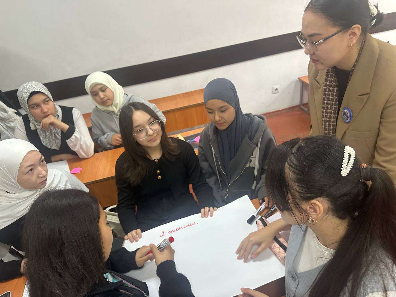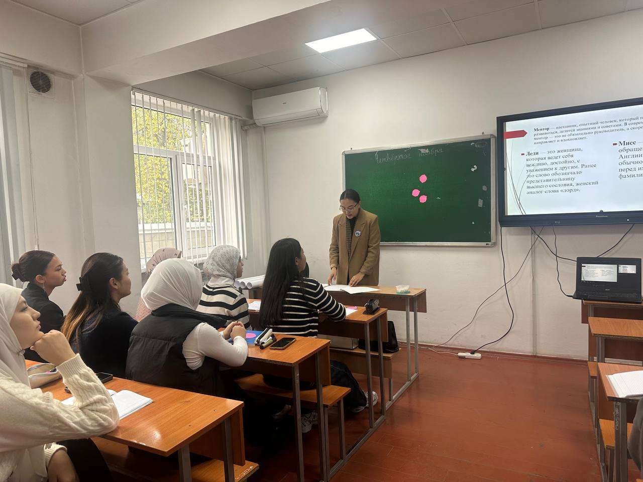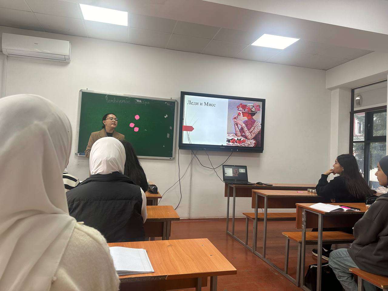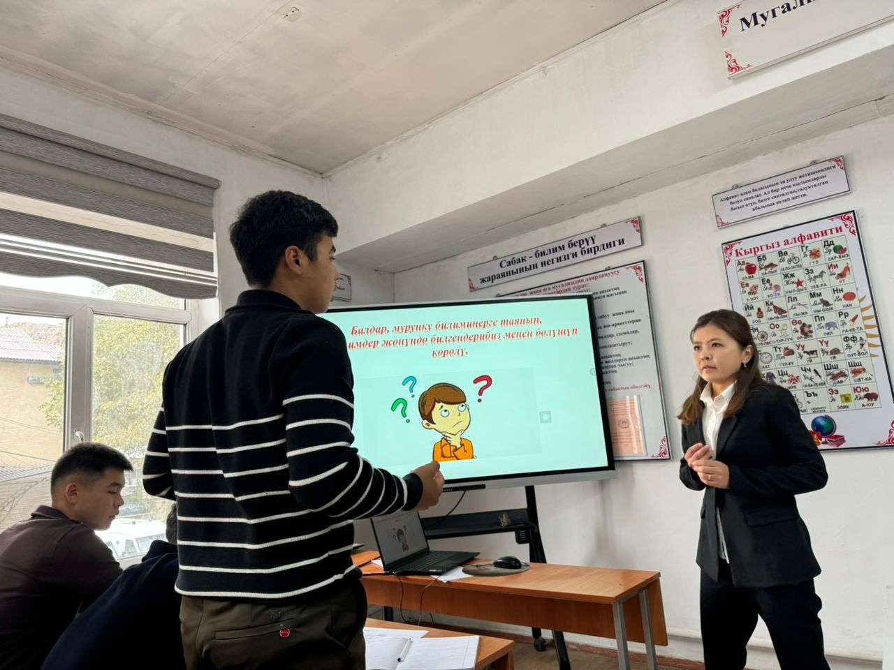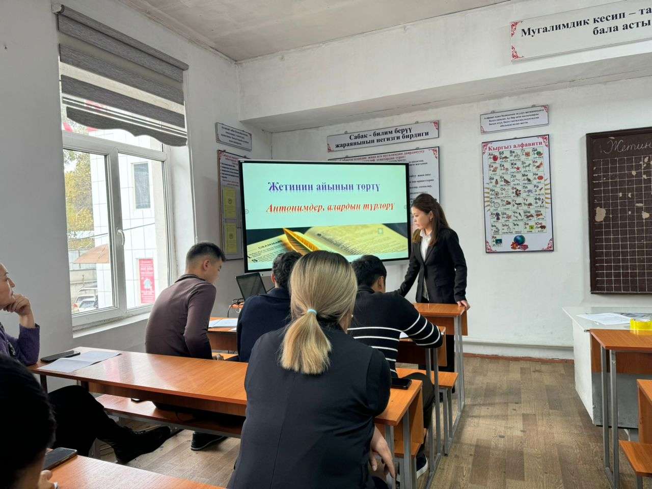Ошондой эле Жоомарт кызы Бактыкан кыргыз тили сабагынан “Антонимдер,алардын түрлөрү” темасында сабак өтүп, студенттерге антонимдердин көркөм тексттеги мааниси жана стилистикалык мүмкүнчүлүктөрү тууралуу терең билим берди. Сабакта чыгармачыл тапшырмалар, талкуулар жана практикалык иш-аракеттер ийгиликтүү жүргүзүлдү.