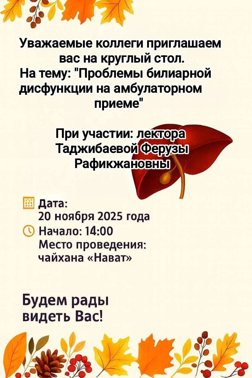 Круглый стол 05:16 21-11-2025 60 20.11.2025г. преподаватель кафедры КД 1 к.м.н., доцент Тажибаева Ф. Р. провела круглый стол для врачей на тему: "Проблемы билиарной дисфункции на амбулаторном приеме". 2025-11-21 05:15:08 2025-11-21 05:15:22 2025-11-21 05:15:35 60 05:16 21-11-2025