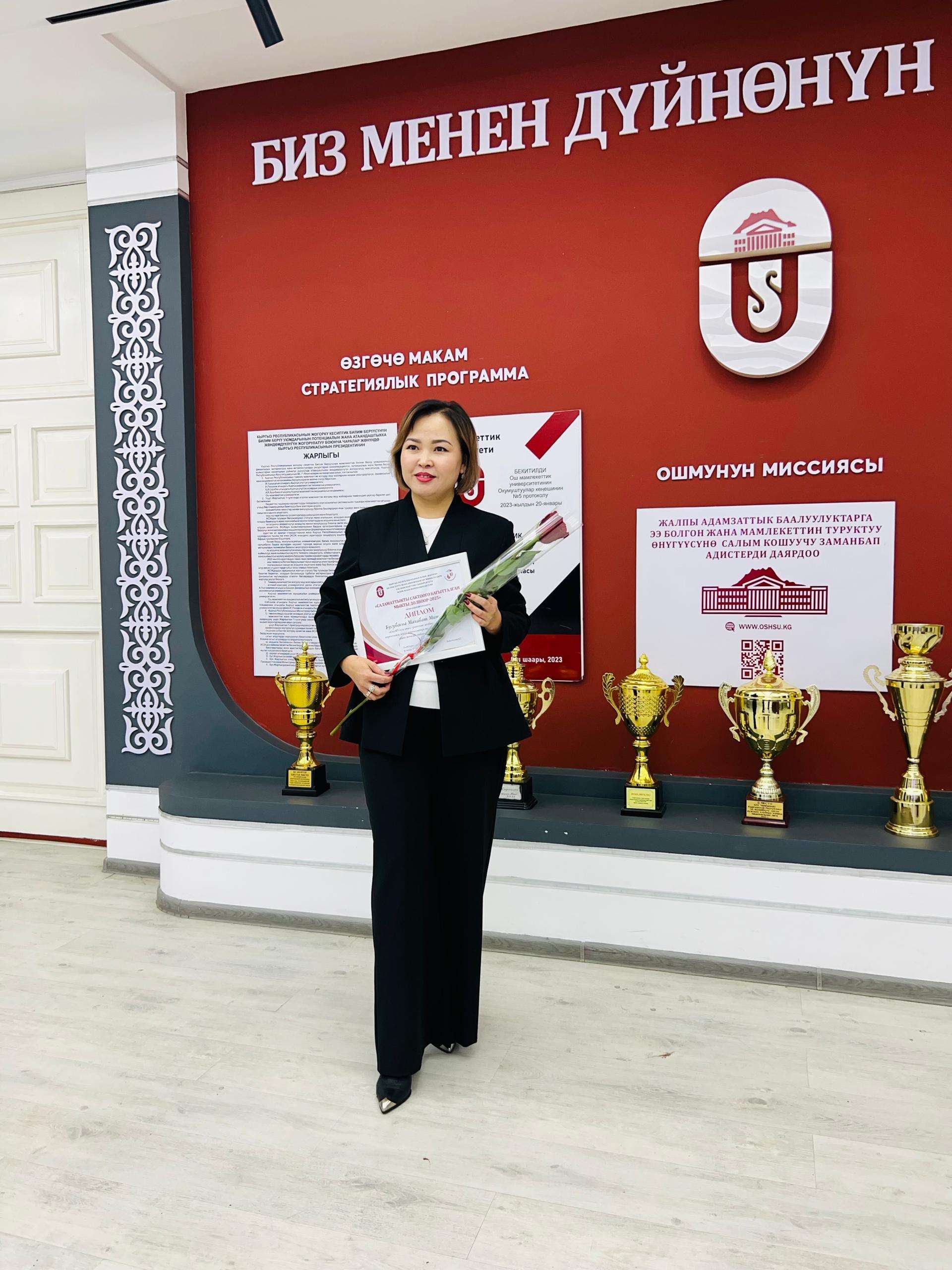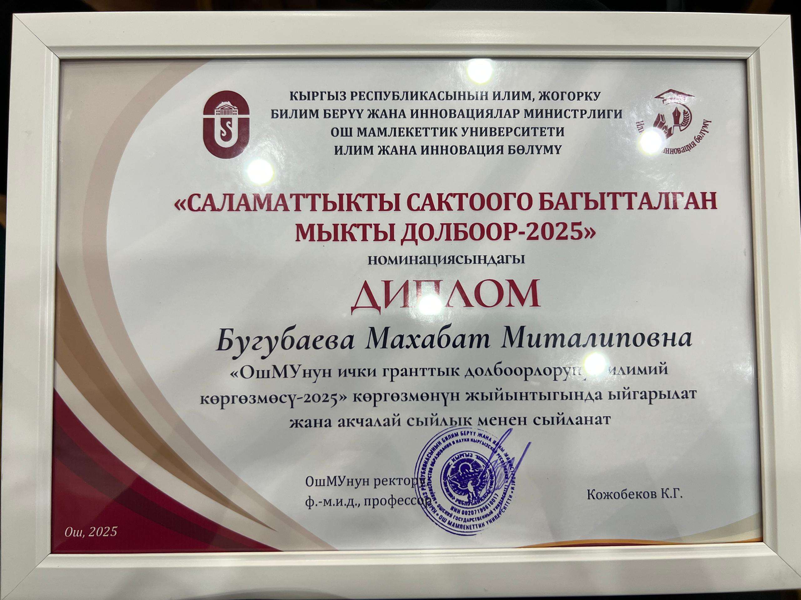 доцент Бугубаева Махабат Миталиповна ОшМУнун ички гранттык долбоорлорунун жүрүшүндө аткарылган илимий иштерге активдүү алып барып, жогорку көрсөткүчтөргө жеткени үчүн диплом менен сыйланды.