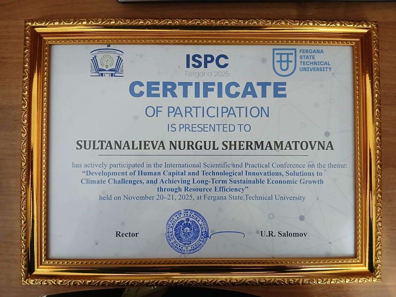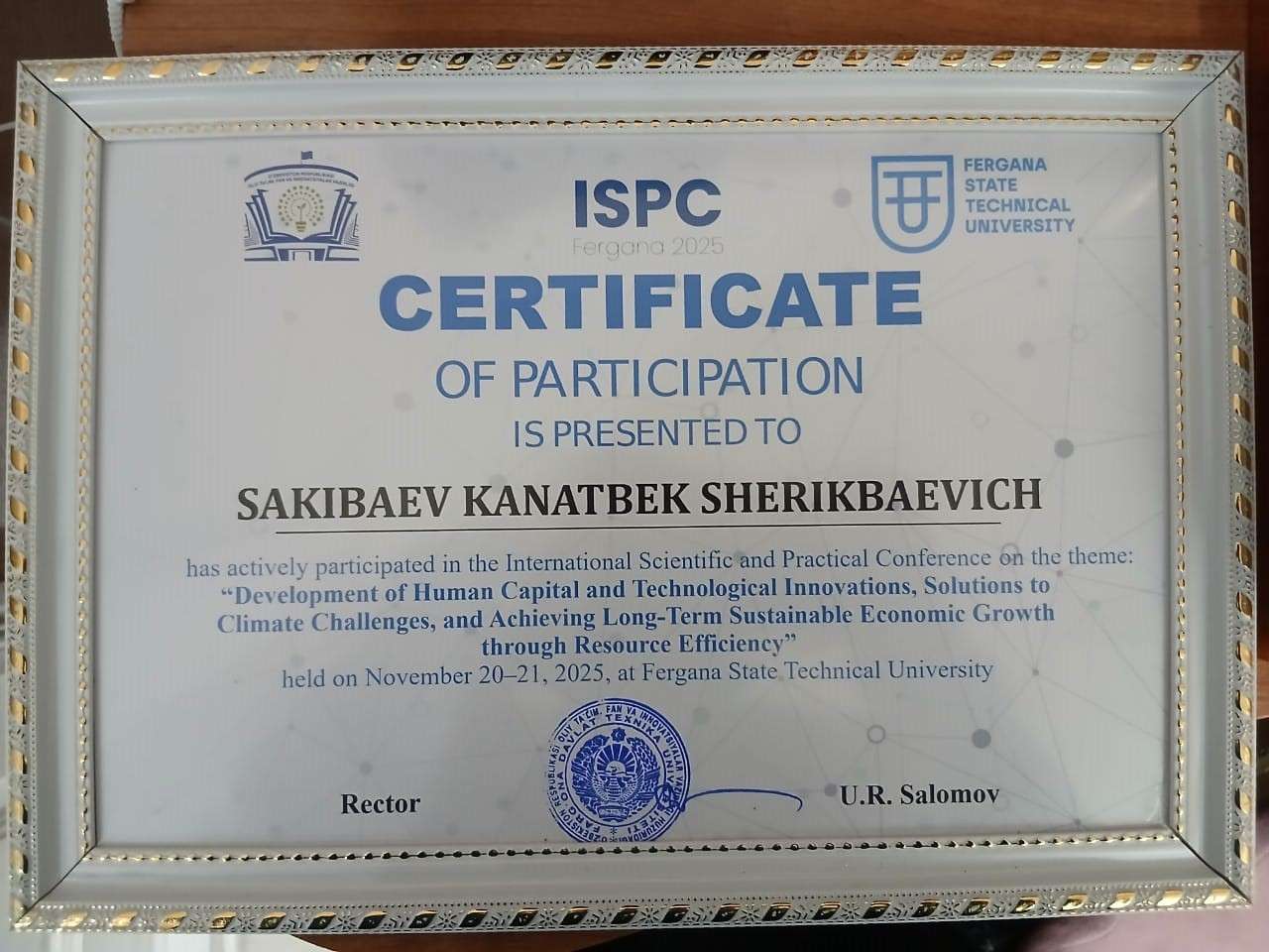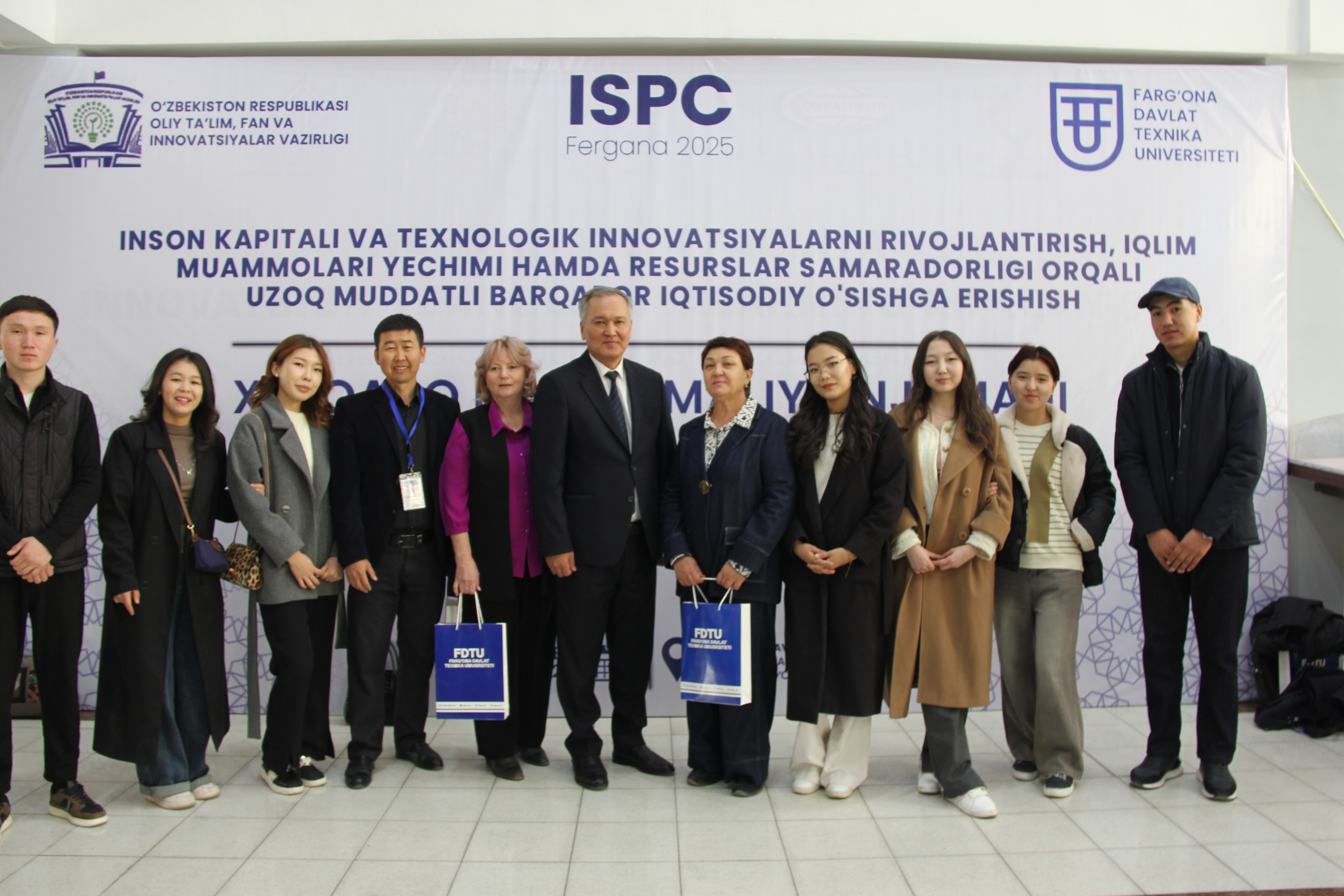 Экономика, бизнес жана менеджмент институтунун «Менеджмент жана маркетинг» кафедрасынын окутуучулары Бекиева Э.Ж., Султаналиева Н.Ш., Исламова У.Б., Сакибаев К.Ш., Талайбек уулу Т., Эсенали кызы Г. 2025-жылдын 20-21-ноябрь күндөрү Фергана мамлекеттик техникалык университетинде «Адамдык капиталды жана технологиялык инновацияларды өнүктүрүү, климаттык көйгөйлөрдү чечүү жана ресурстарды натыйжалуу пайдалануу аркылуу узак мөөнөттүү туруктуу экономикалык өсүшкө жетишүү» темасында өткөрүлгөн Эл аралык илимий-практикалык конференцияга катышып келишти.