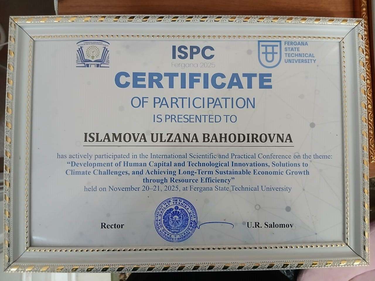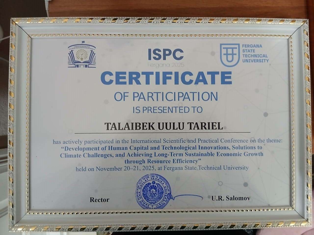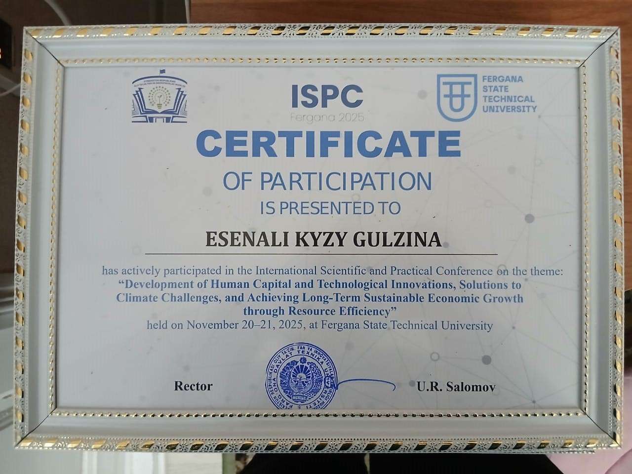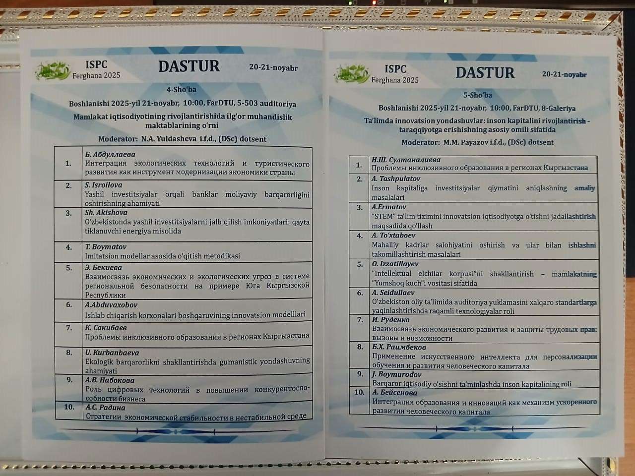 Экономика, бизнес жана менеджмент институтунун «Менеджмент жана маркетинг» кафедрасынын окутуучулары Бекиева Э.Ж., Султаналиева Н.Ш., Исламова У.Б., Сакибаев К.Ш., Талайбек уулу Т., Эсенали кызы Г. 2025-жылдын 20-21-ноябрь күндөрү Фергана мамлекеттик техникалык университетинде «Адамдык капиталды жана технологиялык инновацияларды өнүктүрүү, климаттык көйгөйлөрдү чечүү жана ресурстарды натыйжалуу пайдалануу аркылуу узак мөөнөттүү туруктуу экономикалык өсүшкө жетишүү» темасында өткөрүлгөн Эл аралык илимий-практикалык конференцияга катышып келишти.