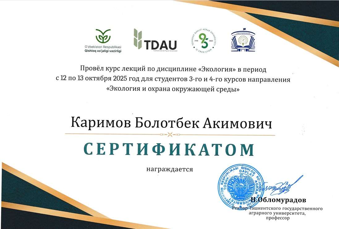 Академиялык мобилдүүлүк программасынын алкагында ОшМУнун ТТДТТжАТ институтунун зоология, экология жана биоинженерия кафедрасынын доценти Б.А. Каримов 2025-жылдын 12-13-ноябрь күндөрү Ташкент мамлекеттик агрардык университетинин «Экология жана курчап турган чөйрөнү коргоо» адистигинин 3-4-курстарынын студенттерине «Экология» предметинен конок лекцияларды окуду.