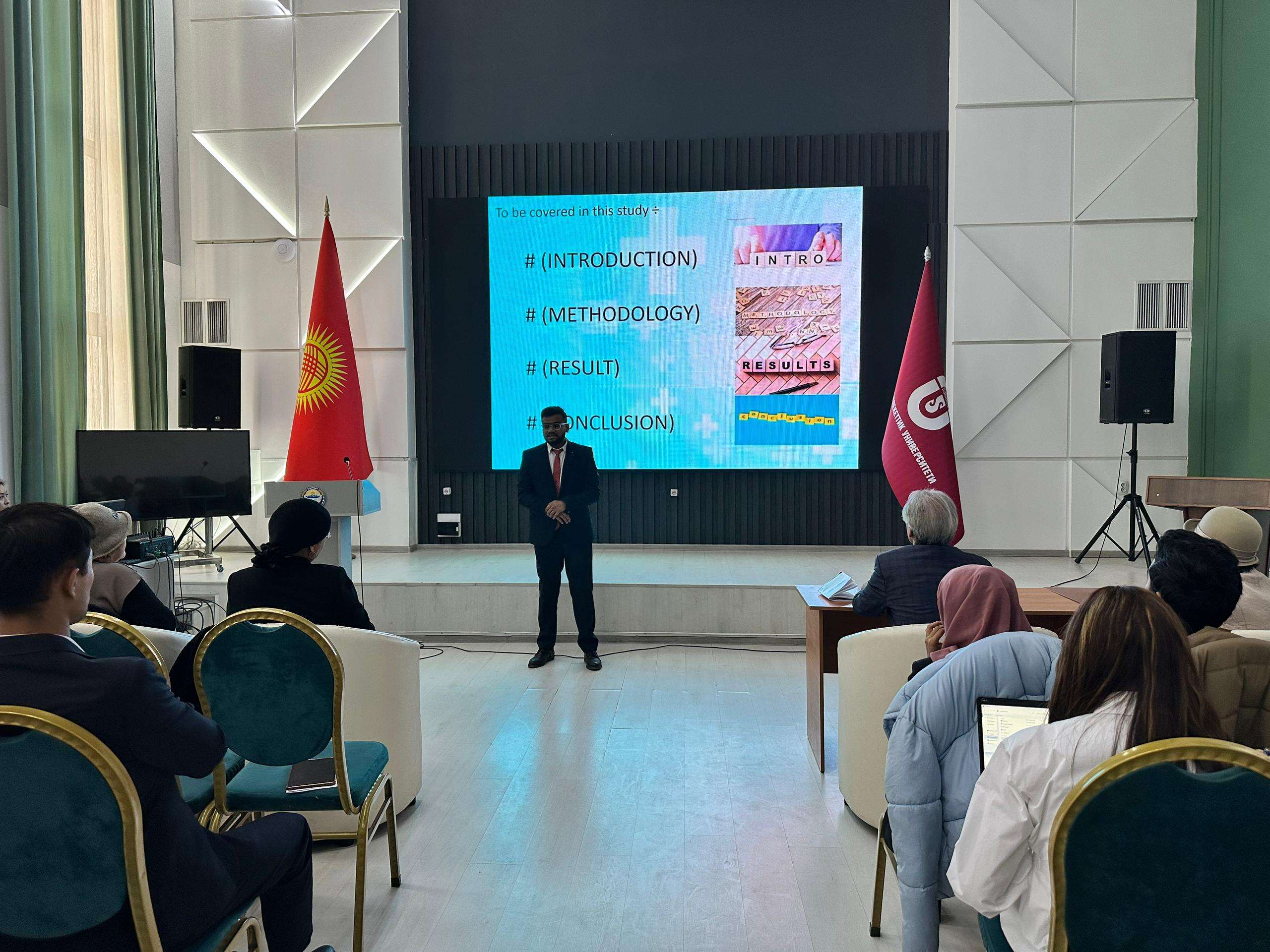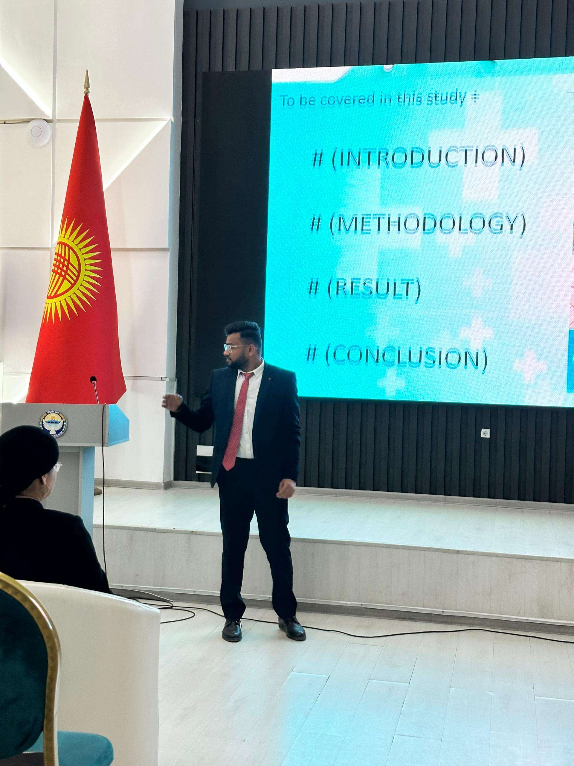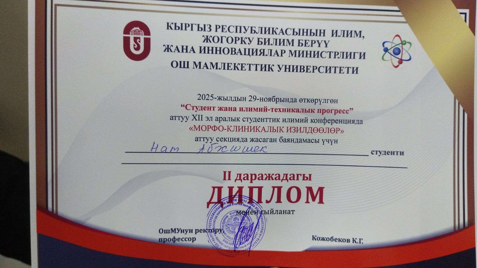 29.11.2025 Студент научно-практического кружка «Юный доктор» Nath Abhishek, 5-й курс, успешно представил научную работу на 12-й Международной студенческой конференции, организованной ОшГУ, на тему: «Анти-В-клеточная терапия при различных степенях системной красной волчанки: результаты двухлетнего наблюдения». Исследование выполнено под научным руководством доцента Салиевой Р.Ш. По итогам выступления студент был награждён дипломом II степени за высокий уровень подготовки и актуальность представленного материала.