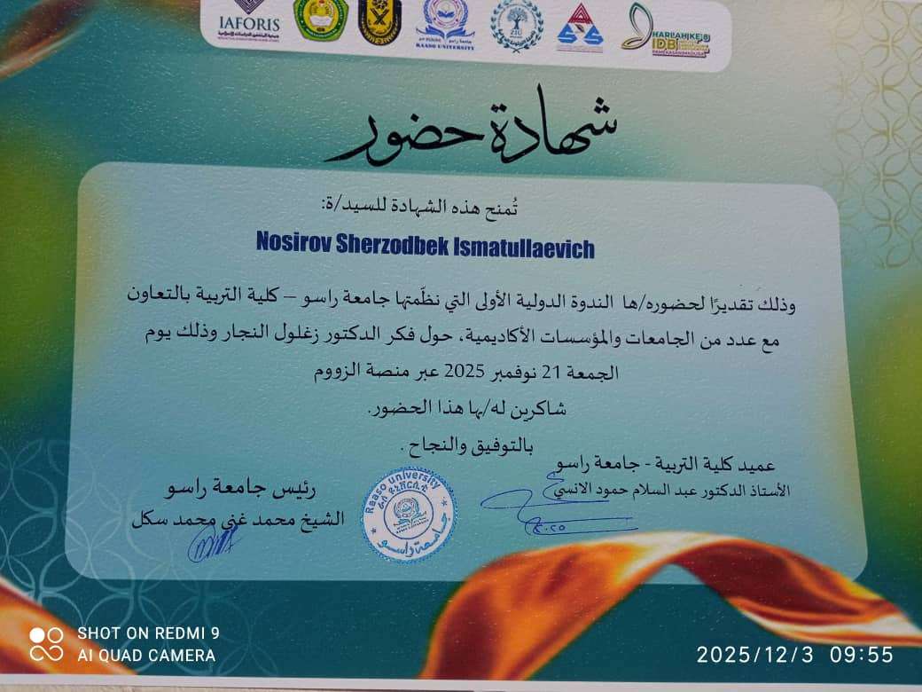 2025-жылдын 21-ноябрында өткөрүлгөн Сомали мамлекети Раасо университети - Билим берүү факультети жана бир катар университеттер жана академиялык мекемелер менен биргеликте уюштурулган Доктор Заглул Ал-Нажжар элесине арналган Эл аралык биринчи симпозиум болуп өттү. Симпозиумга Чыгыш таануу кафедрасынын улук окутуучусу Ш.И. Носиров онлайн катышып сертификатка ээ болду.
