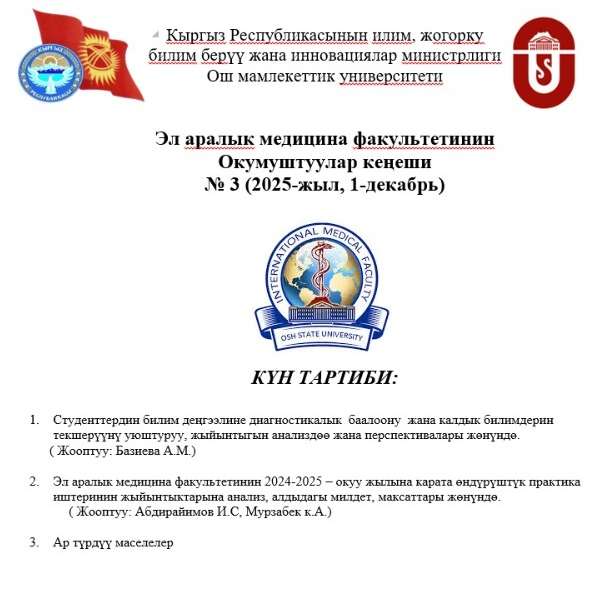 Эл аралык медицина факультетиндеги Окуу-методикалык кеңешинин төрайымы, доцент Базиева А. 2–5-курстардын студенттеринин калдык билимин жана 1-курстун студенттеринин баштапкы билимин диагностикалык тестирлөөсүнүн жыйынтыктары боюнча отчетун ОшМУнун ЭаМФнин Окумуштуулар кеңешинин отурумунда баяндады.