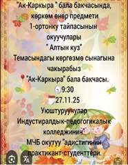 Студенты 3-го курса специальности «Дошкольное педагогическое образование» индустриально-педагогического колледжа в ходе педагогической практики организовали выставку «Золотая осень» (с 3 по 29 ноябрь 2025 года). 27 ноября на выставке был представлены экспонаты д/с №61 «Ак-каркыра». Студенты-практиканты групп «Кулунчак», «Достук», «Кыял», «Жеткинчек», «Балапан», «Жомок» Б. Абдураимова, К. Жалалова, Э. Мамажанова, А. Ормошова, Ф. Пакырдинова и С. Төйтөева выставили художественные работы, выполненные с детьми. По итогам все группы были награждены грамотами.