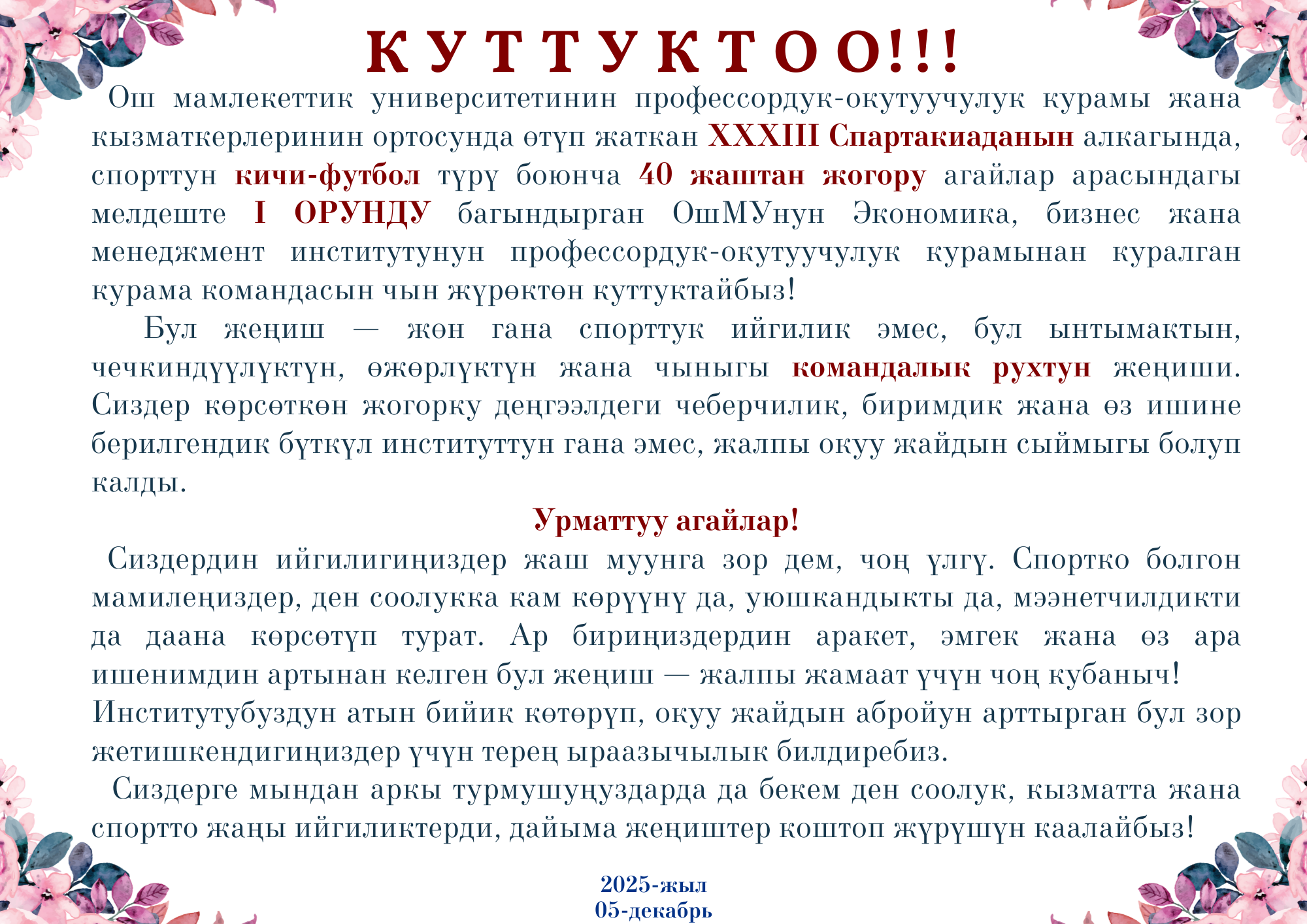 Ош мамлекеттик университетинин профессордук-окутуучулук курамы жана кызматкерлеринин ортосунда болуп жаткан XXXIII СПАРТАКИАДАДА спорттун КИЧИ-ФУТБОЛ түрү боюнча 40 ЖАШТАН ЖОГОРКУ АГАЙЛАР ортосундагы мелдеште I ОРУНДУ ОшМУнун Экономика, бизнес жана менеджмент институтунун профессордук-окутуучулук курамынан куралган спортчулар кайрадан ЧЕМПИОНДУК наамды багындырышты.