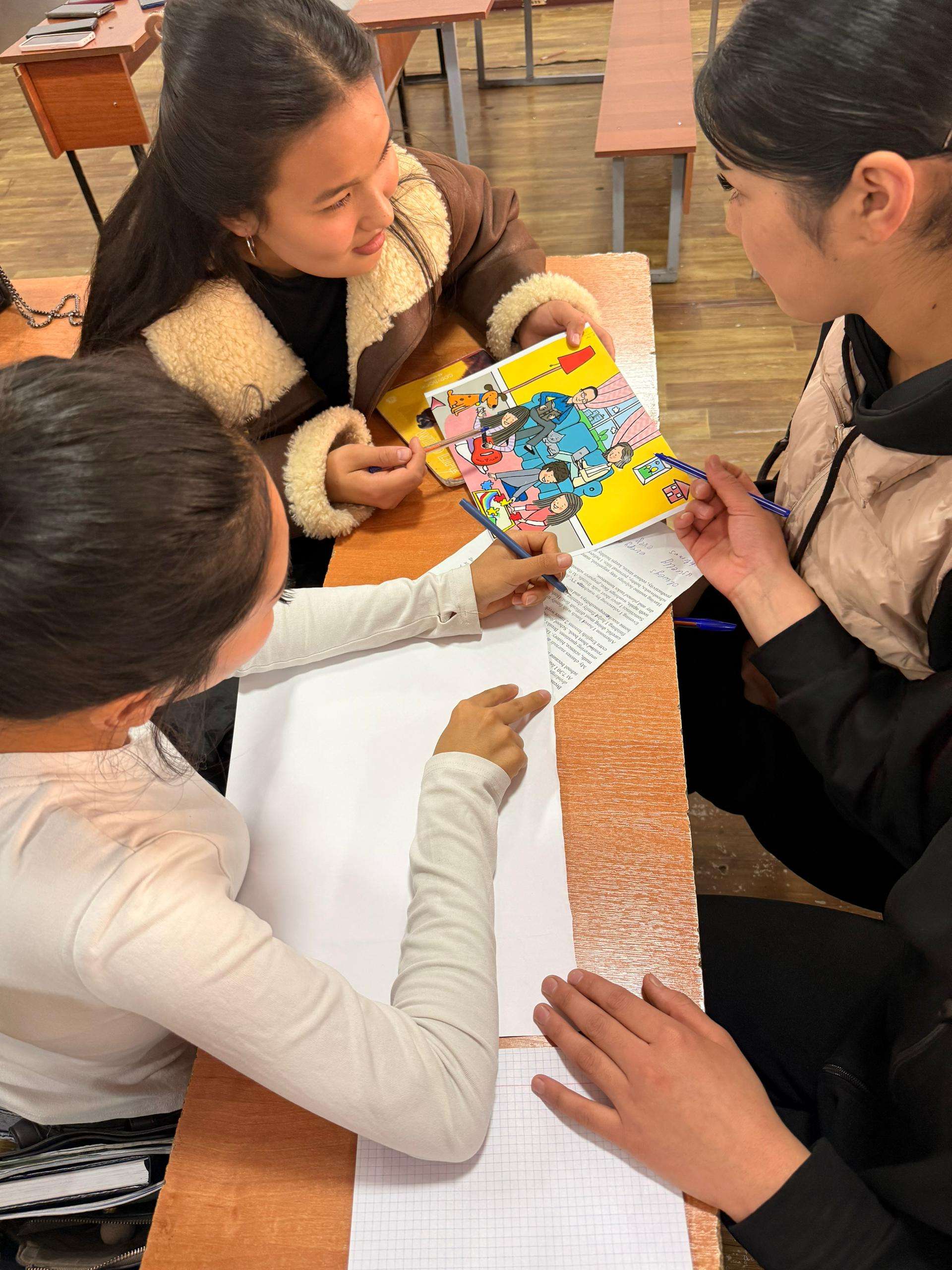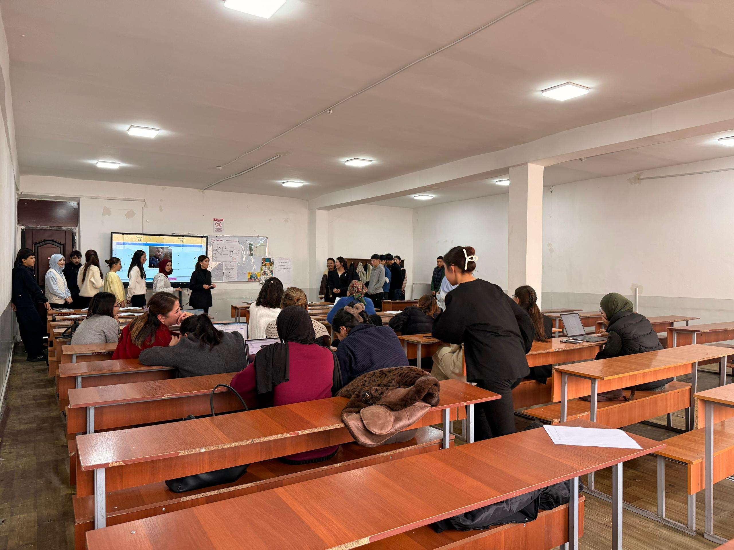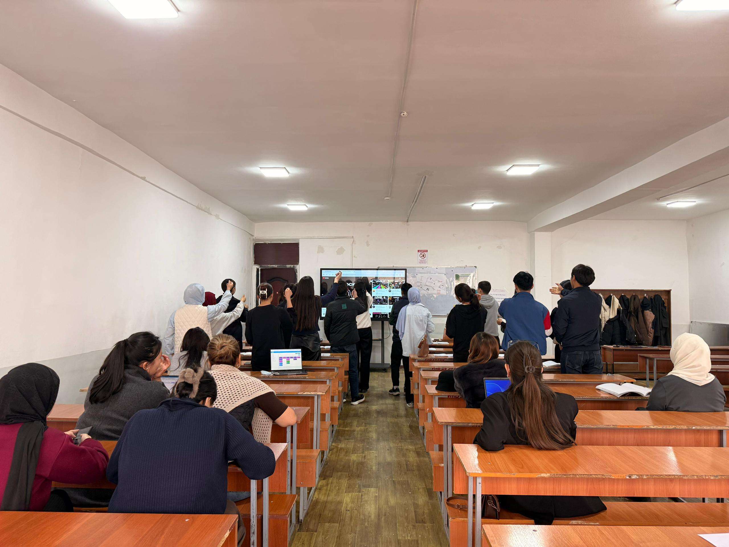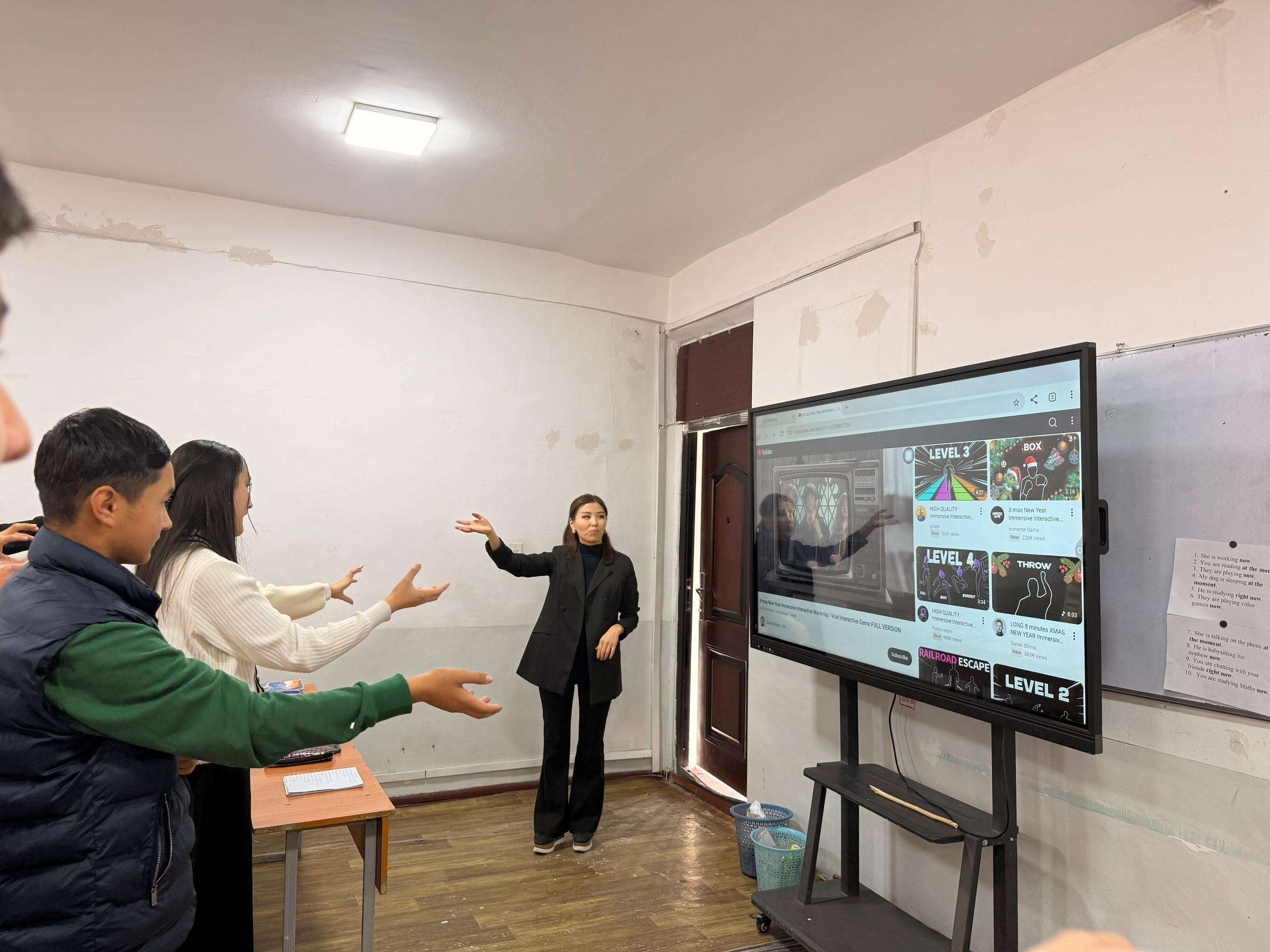 ОшМУнун ЭББПКнын Котормо иши бөлүмүнүн окутуучусу Абдимомун кызы Айгерим “The Present Continuous Tense" темасында 16.12.25 1-курс студенттери үчүн «Негизги чет тили» дисциплинасы (КТПга ылайык) боюнча ачык сабак өттү. Сабакты өткөргөн Абдимомун кызы Айгерим студенттерге Present Continuous убактысынын структурасын жана колдонулушун түшүндүрдү. Студенттер “In the Classroom” темасына тиешелүү лексиканы активдүү практикада колдонушту. Сабакта ошондой эле Wordwall жана Running Dictation сыяктуу интерактивдүү тапшырмалар, сүйлөм түзүү, сүрөттүн негизинде баяндама жасоо иштери жүргүзүлдү. Сабак интерактивдүү форматта өтүп, бардык катышуучулар активдүү катышып, кызыгуусун көрсөтүштү.