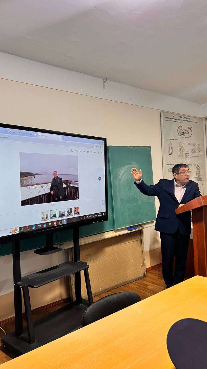 Затем старший научный сотрудник заповедника К. Абдисатаров представил презентацию на тему «Научные экспедиции учёных ОшГУ в государственный природный заповедник “Кулун-Ата”» .
