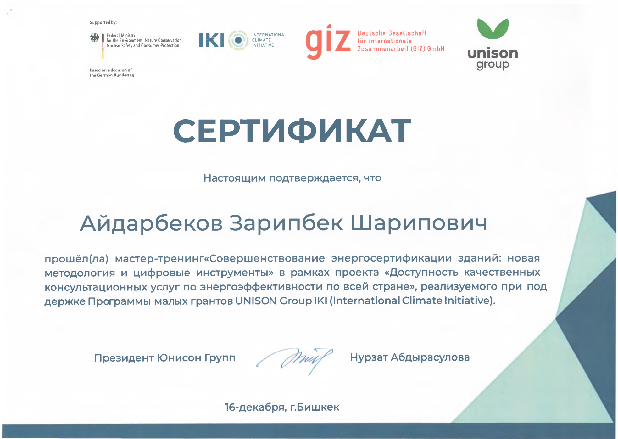 Бул мастер-тренинг Кыргыз Республикасында энергия эффективдүүлүгүн жогорулатуу, улуттук консультанттар реестрин кеңейтүү жана имараттарды энергиялык сертификаттоо системасын санариптик деңгээлге чыгаруу боюнча маанилүү кадам болуп саналат. Бул аракеттер жакынкы жылдары өлкөнүн энергетикалык коопсуздугун бекемдөөгө, курулуш секторунда сапатты жогорулатууга жана жарандардын жашоо шартынын жакшыртылышына өбөлгө түзөт.