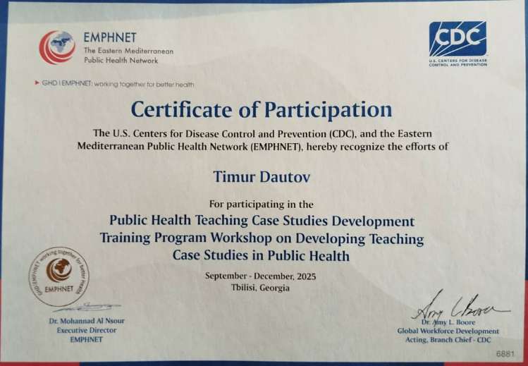 С 8 по 10 декабря 2025 года Даутов Тимур принял участие в региональном воркшопе “Developing Case Studies for FETP-Frontline, Intermediate and Advanced”, организованном Восточно-Средиземноморской сетью общественного здравоохранения EMPHNET.