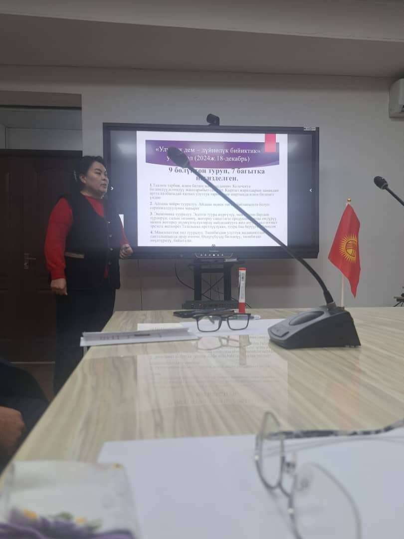 КРдин Президентинин 2024-жылдын 18-декабрындагы ПЖ/369-Жарлыгы менен бекитилген Кыргыз Республикасынын "Улуттук дем-дуйнолук бийиктик" Унгужолу Жарлыгын бир жылдыгына арналган иш-чара ИПКда "Коомдук илимдер жана АЧД ББ" ПЦКсы тарабынан откорулду. Иш-чараны колледждин директору, доцент М.Э. Манашов ачып берип, доценттер Г.А. Анарбаева жана Г.Б. Тумонбаевалар соз суйлошту. Иш-чаранын журушундо доценттер М.А. Маматов жана М.И.Чыналиевалар, окутуучулар С.А.Кудайбердиев, С.К. Исакуловтор мазмундуу баяндамаларды жасашты. Жалпы талкуулоо менен иш-чара жыйынтыкталды