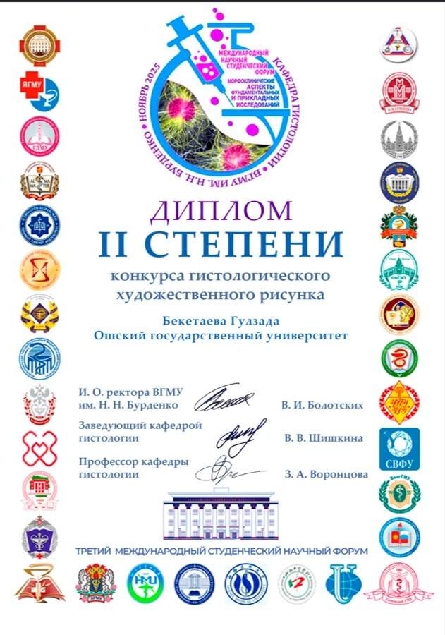 23 декабря 2025 года в конкурсе гистологического художественного рисунка в рамках международного студенческого научного форума по морфоклиническим аспектам фундаментальных и прикладных исследований, который прошел в городе Воронеж РФ студентка ММФ 2-го курса группы ЛКУ-1-24 Бекетаева Гулзада награждена дипломом II степени. Научный руководитель: доцент Назгул Ташматова.