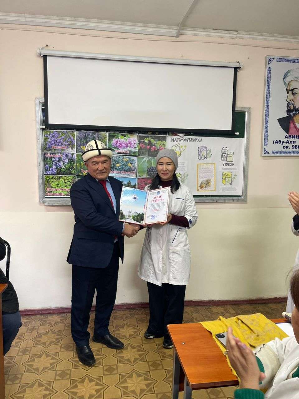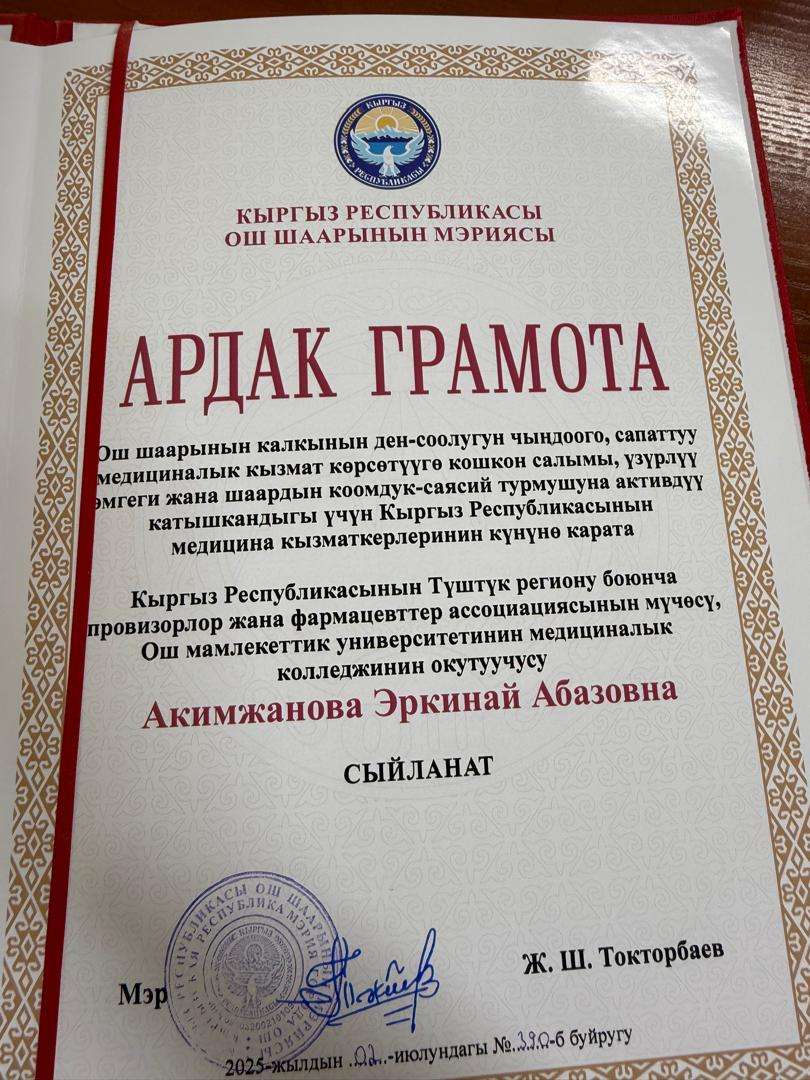 Биздин окутуучулар 2025-жылдагы үзүрлүү эмгеги, мугалимдик ыйык кесипти аркалап, жаштарга татыктуу билим берип жаткандыгы, чыгармачылык иштериндеги жемиштүү ийгиликтери жана коомдук иш-чараларга активдүү катышкандыгы үчүн Кыргыз Республикасынын Саламаттыкты сактоо министрлигине караштуу Түштүк региону боюнча провизорлор жана фармацевттер ассоциациясынын АРДАК ГРАМОТАСЫ менен сыйланышты.