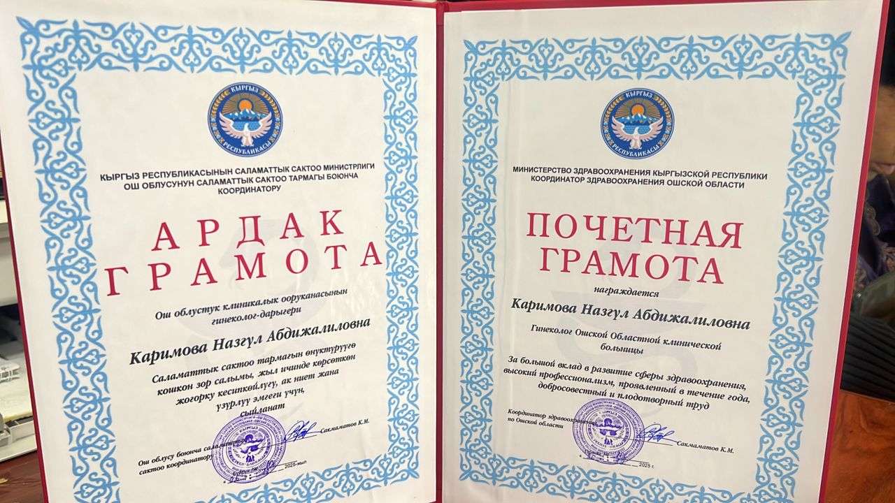 Каримова Назгул Абдижалиловна награждена Почётной грамотой координатора здравоохранения Ошской области.