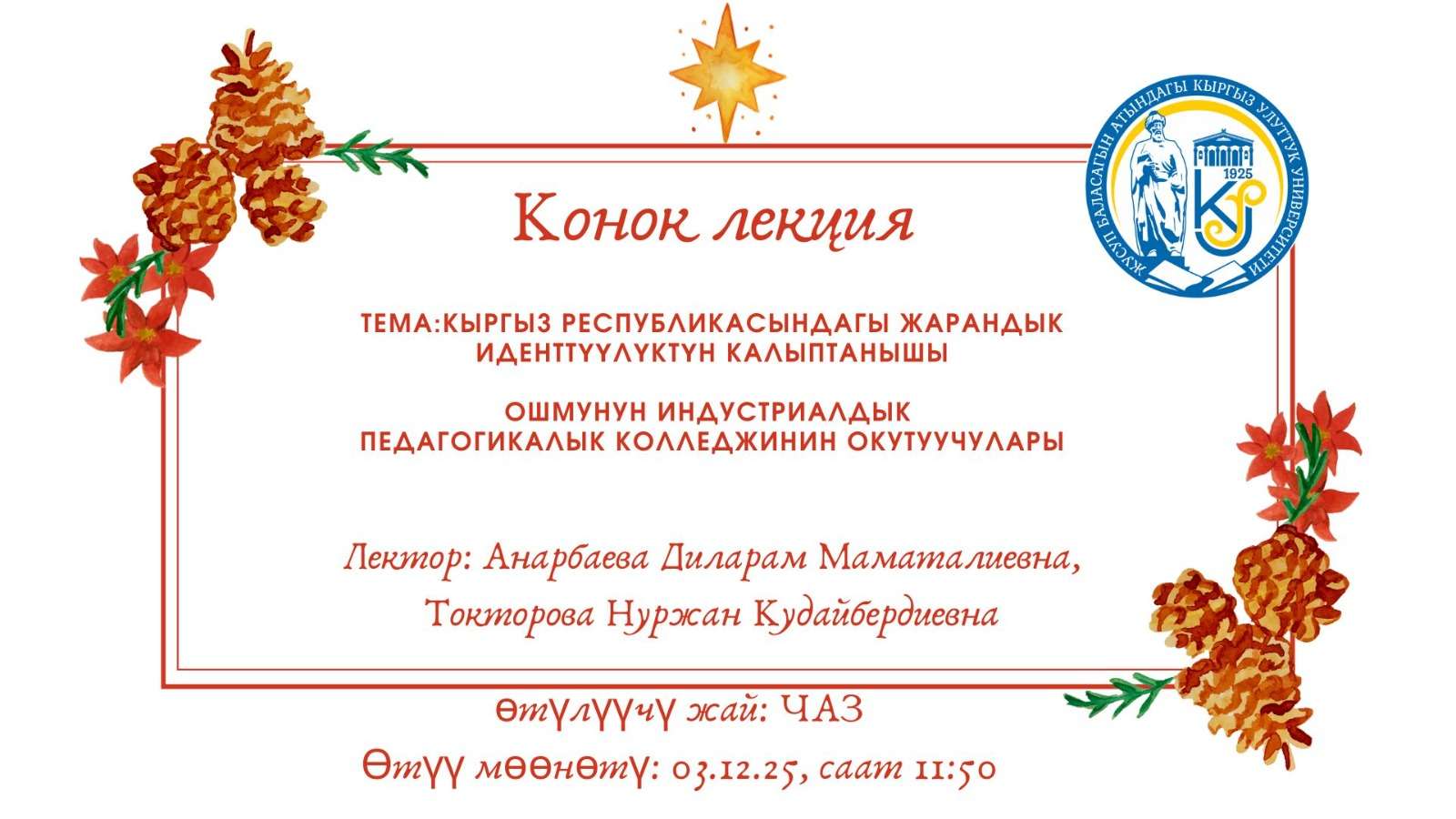 2025-жылдын 3-декабрында Ош мамлекеттик университетинин Финансы жана юридикалык колледжинин Коомдук илимдер жана аскерге чейинки даярдоо билим берүү ПЦКнын окутуучулары Д.М. Анарбаева жана Н.К. Токторова Жусуп Баласагын атындагы Кыргыз Улуттук Университетинин Ош шаарындагы Гуманитардык табигый илимдер факультетинин экинчи курстун студенттери үчүн "Кыргыз Республикасында жарандык иденттүүлүктүн калыптанышы" деген темада конок лекциясын окуу үчүн барышты. Лекцияда төмөнкү негизги темалар камтылды: этникалык жана жарандык иденттүүлүктүн айырмачылыктарын талдоо. Жарандык иденттүүлүк мамлекетке таандык болуу сезимине, анын мыйзамдарына, мамлекеттик тилге жана этникалык тегине карабастан жалпы баалуулуктарга негизделгени баса белгиленди. Мамлекеттик саясаттын артыкчылыктуу багыттарына өзгөчө көңүл бурулду. Иш-чара кесиптештердин арасында чоң кызыгууну жаратты. Лекциядан кийин студенттер менен маданияттар аралык диалог жана укуктук сабаттуулукка багытталган талкуу болду. Ийгиликтүү презентациялары үчүн окутуучулар Д.М. Анарбаева жана Н.К. Токторова ыраазычылык каттар менен сыйланышты. Бул сапар академиялык байланыштарды чыңдоодо жана Кыргызстанда маалыматтуу жарандыкты өнүктүрүүнүн жолдорун биргелешип изилдөөдө маанилүү кадам болуп калды.