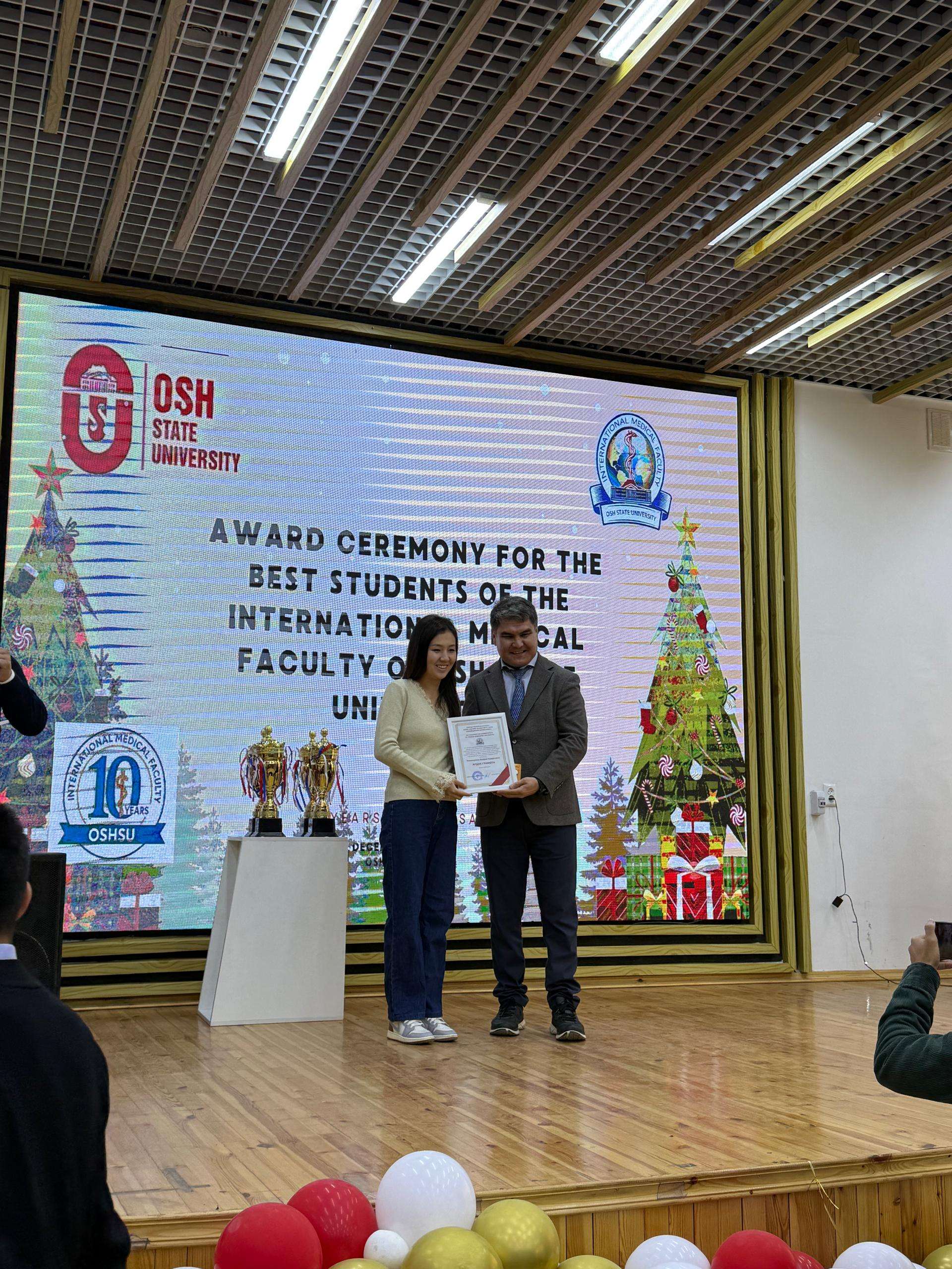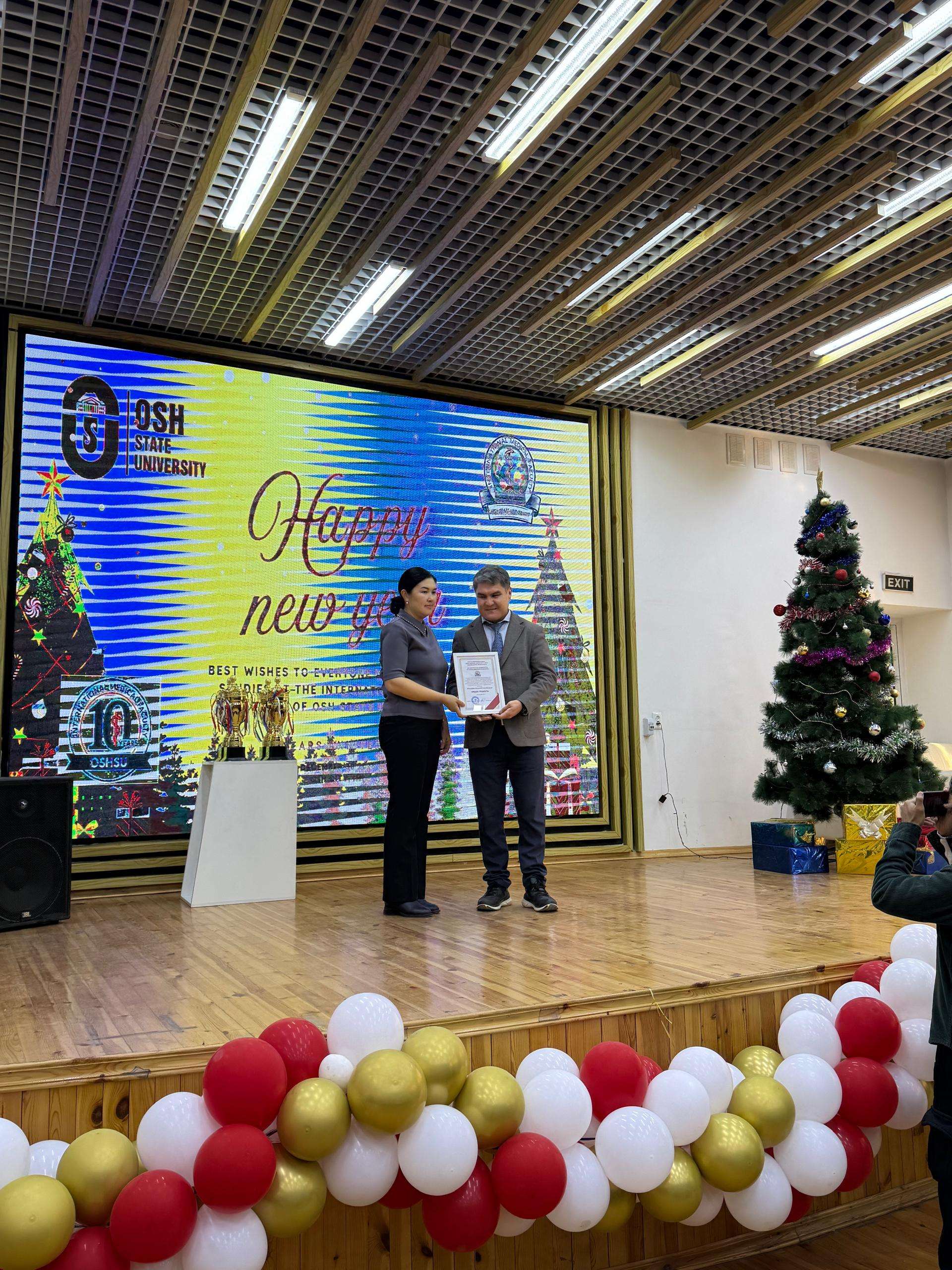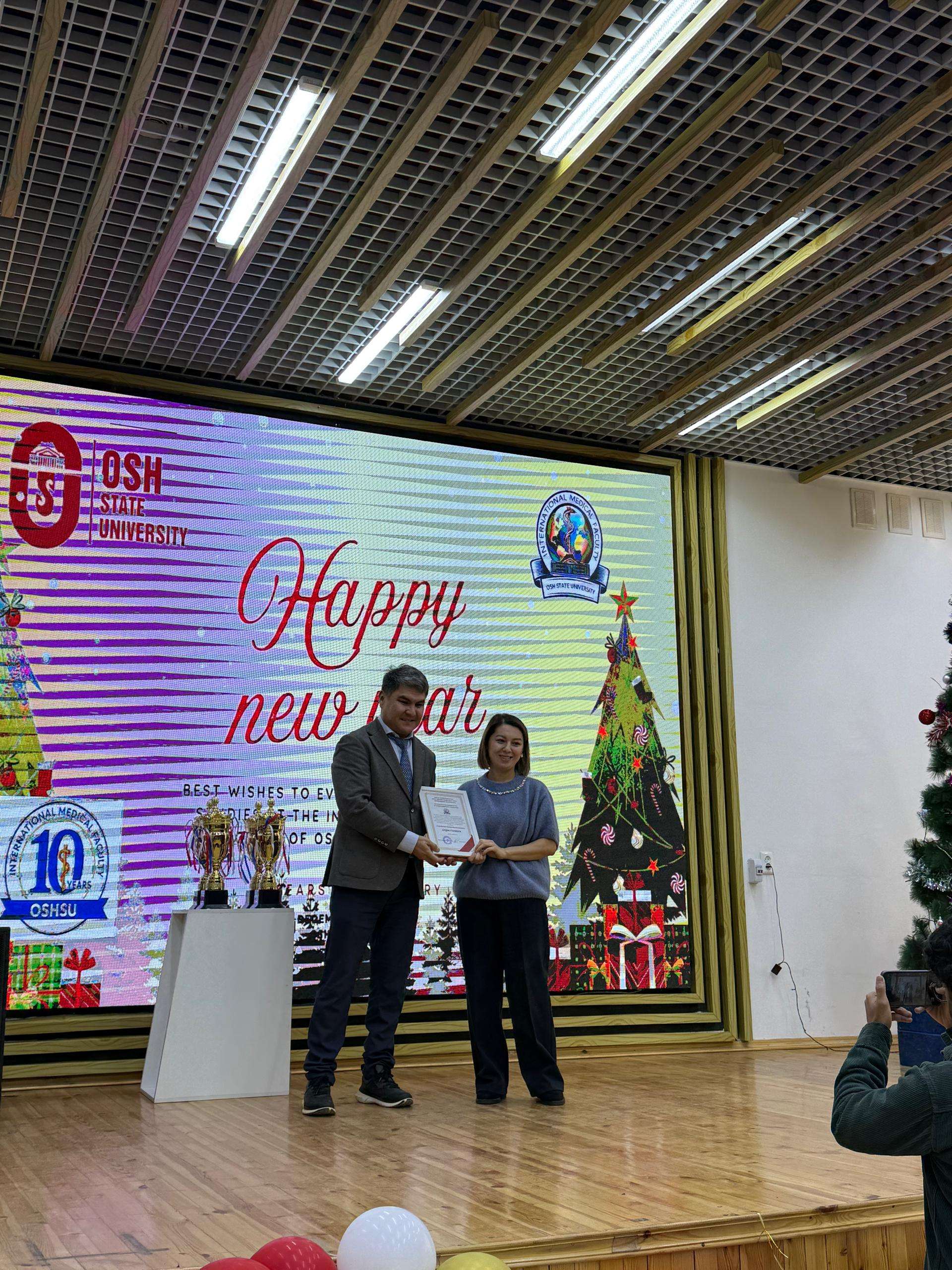 2025-жылдын жыйынтыгы боюнча Клиникалык дисциплиналар 1 кафедрасынын окутуучулары Мамырова К.К., Карабекова Н.М., Мамажанова М., ошондой эле методист Таалайбекова Э. жогорку кесипкөйлүгү, ак ниет эмгеги жана медициналык билим берүүнү өнүктүрүүгө кошкон салымы үчүн ардак грамоталар менен сыйланышты.