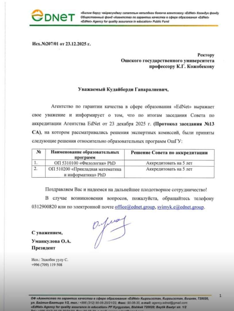 Ош мамлекеттик университетинин 531000 — «Филология» багыты боюнча докторантура (PhD) программасы «EdNet» билим берүү сапатын кепилдикке алуу агенттиги тарабынан ийгиликтүү аккредитацияланып, 2030-жылга чейин 5 жылдык мөөнөткө тастыкталды. Бул жетишкендик окуу жайдагы илимий-изилдөө чөйрөсүнүн жогорку деңгээлин, профессордук-окутуучулук курамдын кесипкөйлүгүн жана билим берүү процесстеринин эл аралык стандарттарга төп келерин далилдейт. Эксперттик комиссия программанын күчтүү материалдык-техникалык базасын жана илимий кадрларды даярдоодогу системалуу мамилесин өзгөчө белгилешти. Бул чечим докторанттардын изилдөөлөрүн эл аралык деңгээлге чыгарууга жана ОшМУнун дүйнөлүк академиялык чөйрөдөгү аброюн чыңдоого жаңы мүмкүнчүлүктөрдү ачат.