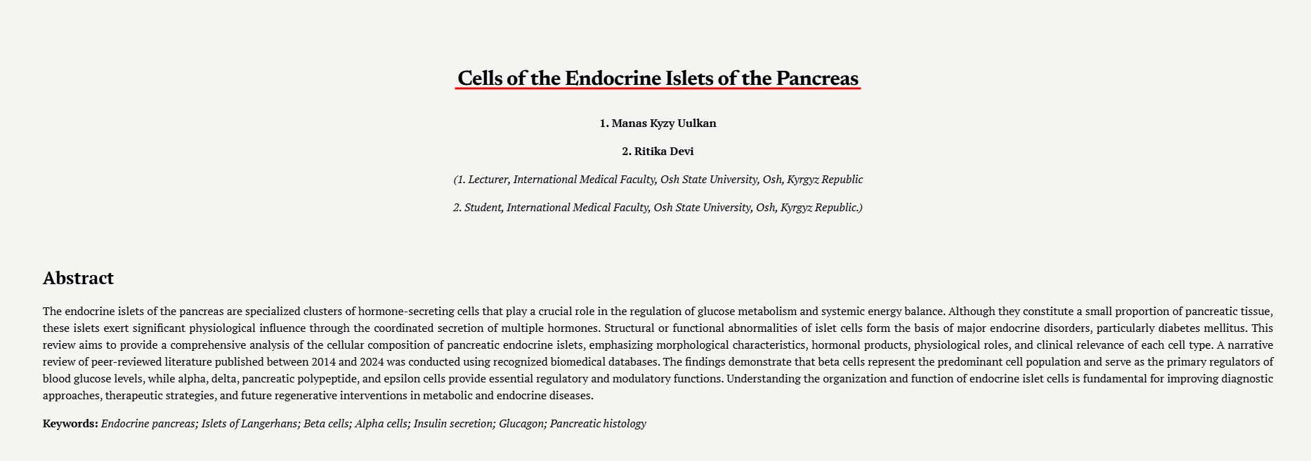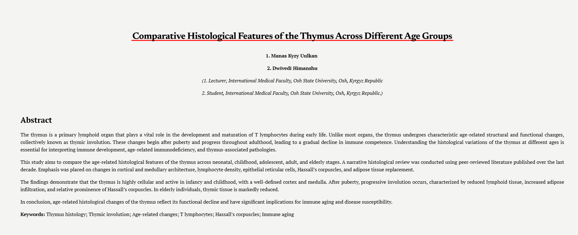 АГНФ кафедрасынын окутуучусу Манас кызы Уулкан 1-курстун студенттери менен биргеликте Двиведи Химаншу (тема: "Ар кандай курактык топтордогу тимустун салыштырмалуу гистологиялык өзгөчөлүктөрү") жана Ритика Деви (тема: "Уйку безинин эндокриндик аралчаларынын клеткалары") биргелешкен илимий макала жарыялашты.