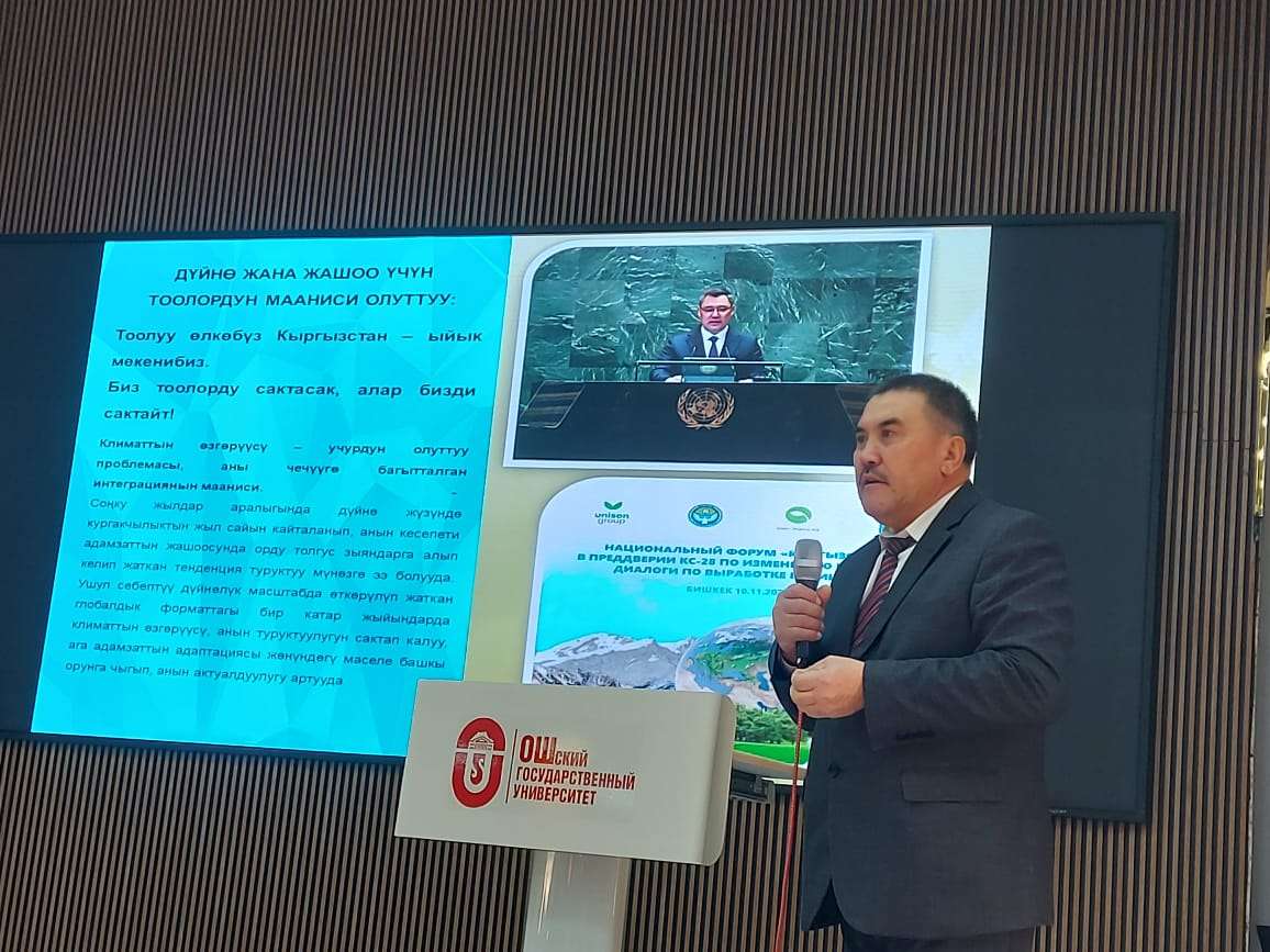 Лектор, Ош мамлекеттик университетинин доцентти, г.и.к., ОшМУнун тоо экосистемаларын коргоо жана жашыл инновациялар консалтинг борборунун директору А.У. Аккулов "Учурдагы экологиялык көйгөйлөр, экологиялык кырдаал жана шаардагы экологиялык абал" жөнүндө студенттерге маалымат берип, суроо-жооптор уюштурулду.