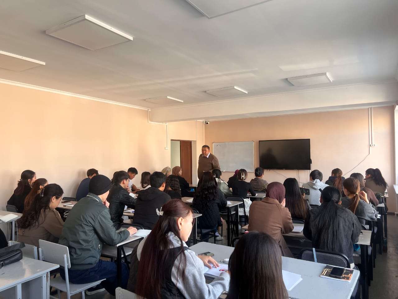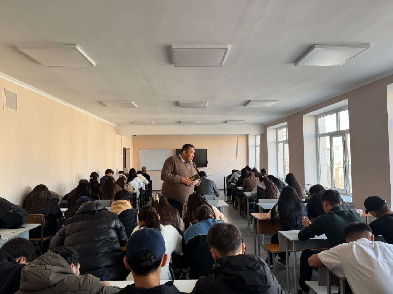 On December 2, 2025, Candidate of Economic Sciences, Associate Professor of the Institute of Business and Management K. Ismanaliev delivered a guest lecture for first-year students (11 base) and second-year students (9 base) on the topic “State Social Policy.”The guest lecture was very engaging and informative. Meaningful and insightful information was presented on issues of social protection of the population, regulation of the labor market, development of education and scientific research, the healthcare sector, as well as support for youth and young families. Students received answers to all the questions they asked.The guest lecture was attended by FBI instructors: Karimova G.A., Karabaeva T.Zh., Sooronbek kyzy T., Anarbay kyzy A., Taabaldieva G.