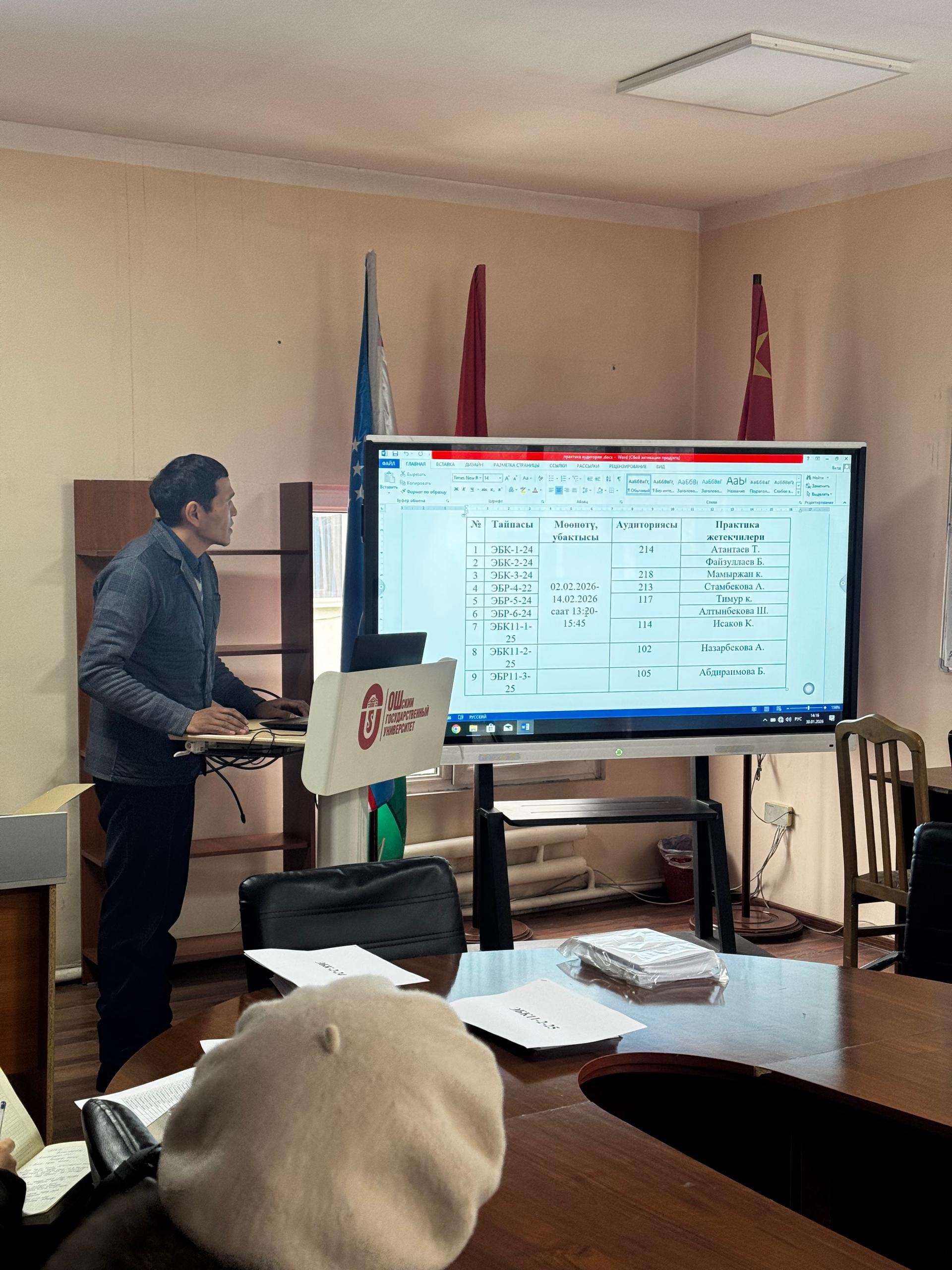 Практика мезгилинде учурда иштеп жаткан курулуш тармагындагы ЖЧК “Карагай курулуш” ишканасынын практикалык мисалдардын топтомун Б.Ж.Файзуллаев ишканадан алып келип,бөлүмдөгү тийиштүү окутуучулар менен биргеликте талкуу жүргүздү. Практиканын максаты студенттерге бухгалтердик баштапкы документтерди толтуруу менен финансылык отчеттуулукту түзүүнү үйрөтүү. 16-февралдан 14-мартка чейинки аралыкта студенттер практикасын өндүрүштө улантышат
