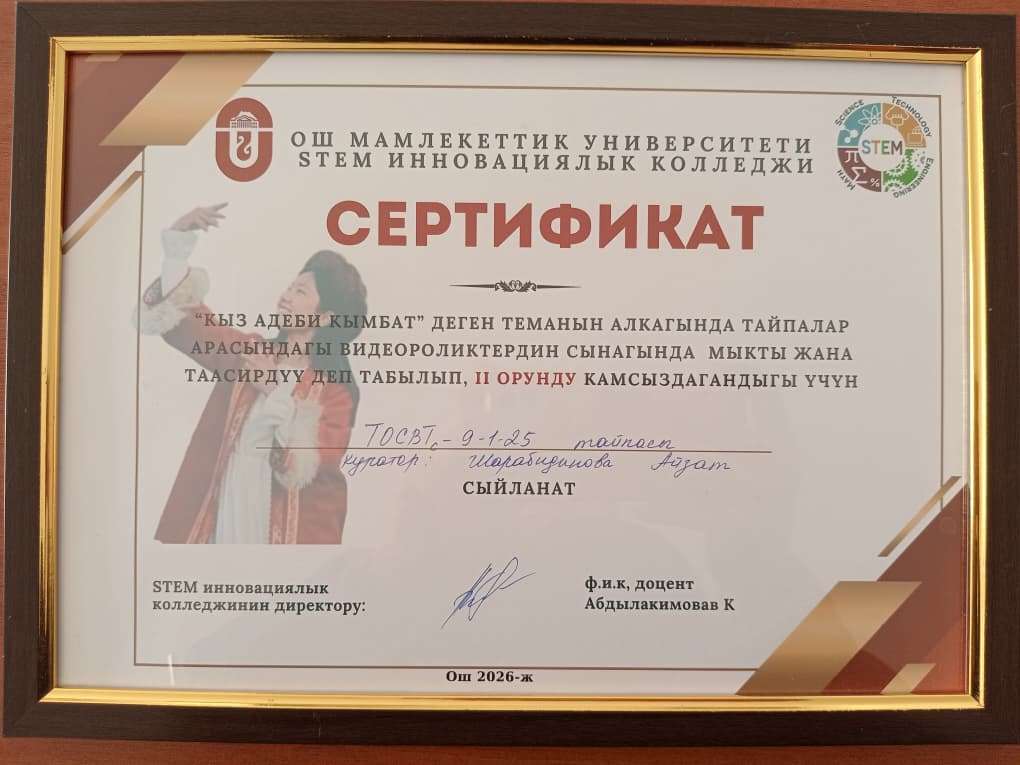 “Кыз адеби кымбат” сынагы болуп өттү 06:16 06-02-2026 39 ОшМУнун STEM инновациялык колледжи тарабынан уюштурулган “Кыз адеби кымбат” деген теманын алкагында сынакта колледждеги тайпалар арасында ТОСВТ9-1-25 тайпасы II орунду камсыздады. Куратору: Шарабидинова А.Э. 2026-02-06 06:13:16 2026-02-06 06:14:21 39 06:16 06-02-2026