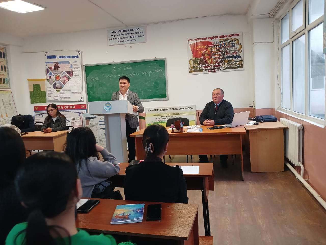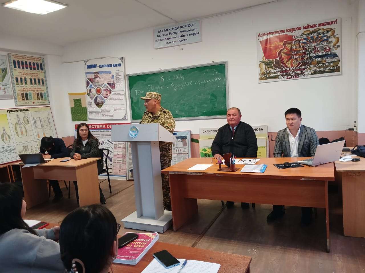 Бүгүн ОшМУнин КМОПто 6-февраль күнү, АЯС-9-1-25 тайпасында “Илим” күнүнө карата ИПК нын Коомдук илимдер жана аскерге чейинки даярдоо билим берүү циклынын окутуучулары камдагы полковник Абдибаитов М.Т., камдагы майор Бакиров К.Ш., камдагы майор Жоробаев Б.Ш. жана чакырылган коноктор Ош МУ КМОПТун директору Маматжан уулу М., Акимжан кызы М., КМОПтун илимий жетекчиси( жооптусу), Алмаз улуу А., окутуучу, ОшМУ ФЮКтан “Табият тануу ПЦКсынан айыл чарба илимдеринин кандидаты Беккулов М.И., “Илим”ге байланыштуу иш чара төмөнкү Темасында өткөрүлдү: “Илим жоопкерчилик катары” Коомдун илимий өнүгүүсүндөгү жаштардын ролу.