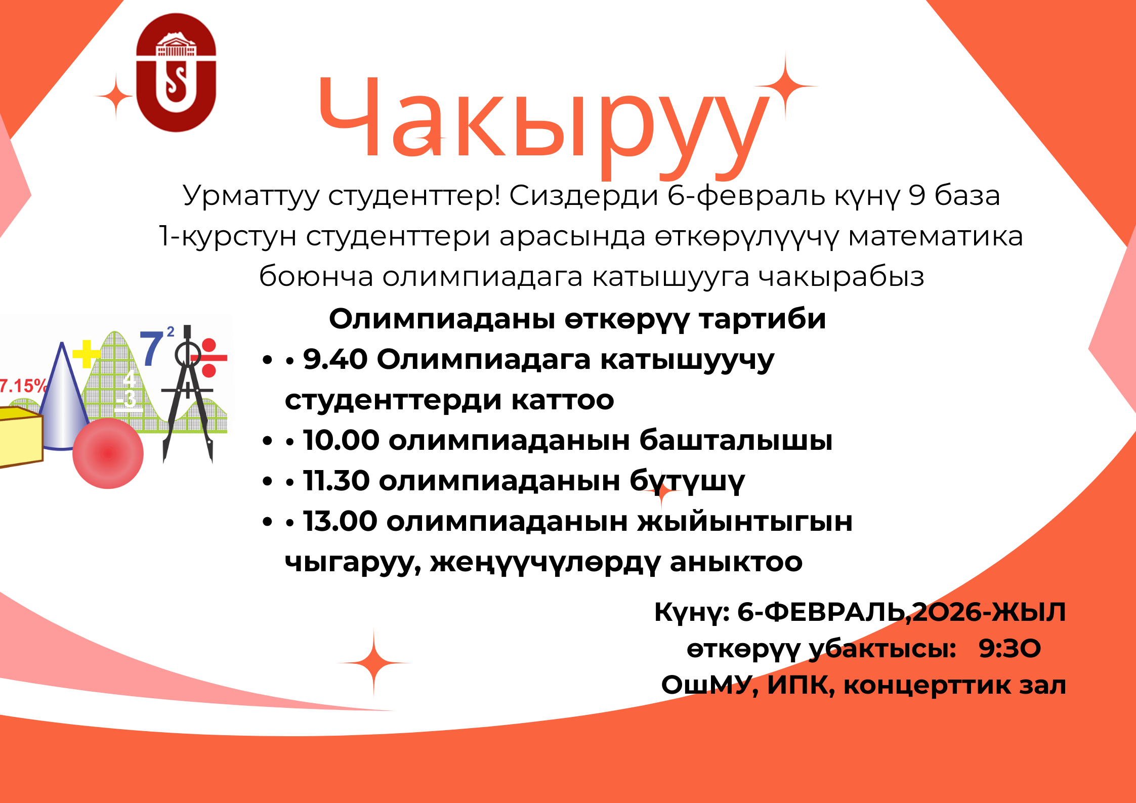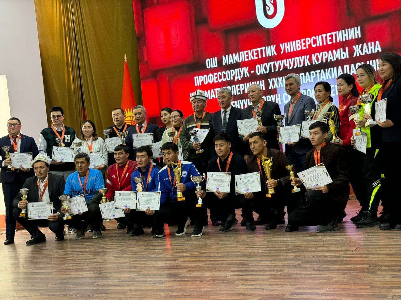 Спартакиадага ректораттын, институттардын, факультеттердин жана колледждердин 40 жашка чейинки жана 40 жаштан жогорку курактагы кызматкерлеринен түзүлгөн командалар катышты. Мелдештер декабрь айы бою дем алыш күндөрү спорттун сегиз түрү боюнча өткөрүлдү: волейбол, баскетбол, футбол, кичи футбол, стол тенниси, тогуз коргоол, аркан тартыш жана шахмат.