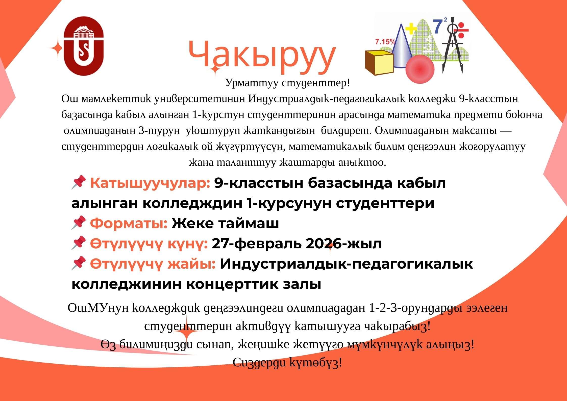Ош мамлекеттик университетинин Индустриалдык-педагогикалык колледжи 9-класстын базасында кабыл алынган 1-курстун студенттеринин арасында математика предмети боюнча олимпиаданын 3-турун уюштуруп жаткандыгын билдирет. Олимпиаданын максаты — студенттердин логикалык ой жүгүртүүсүн, математикалык билим деңгээлин жогорулатуу жана таланттуу жаштарды аныктоо.
