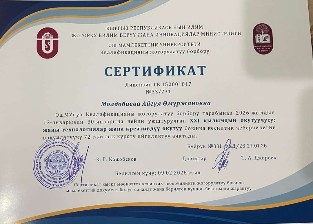 ОшМУнун квалификацияны жогорулатуу институту тарабынан уюштурулган «21-кылымдын окутуучусу: жаны технологиялар жана креативдуу окутуу» (72 сааттык), кваликацияны жогорулатуу курсуна январь айында Эл аралык медицина факультетинин табигый илимдер жана математика кафедрасынын окутуучулары Тешебаева У.Т., Молдобаева А.О. лар катышып, сертификатга ээ болушту.
