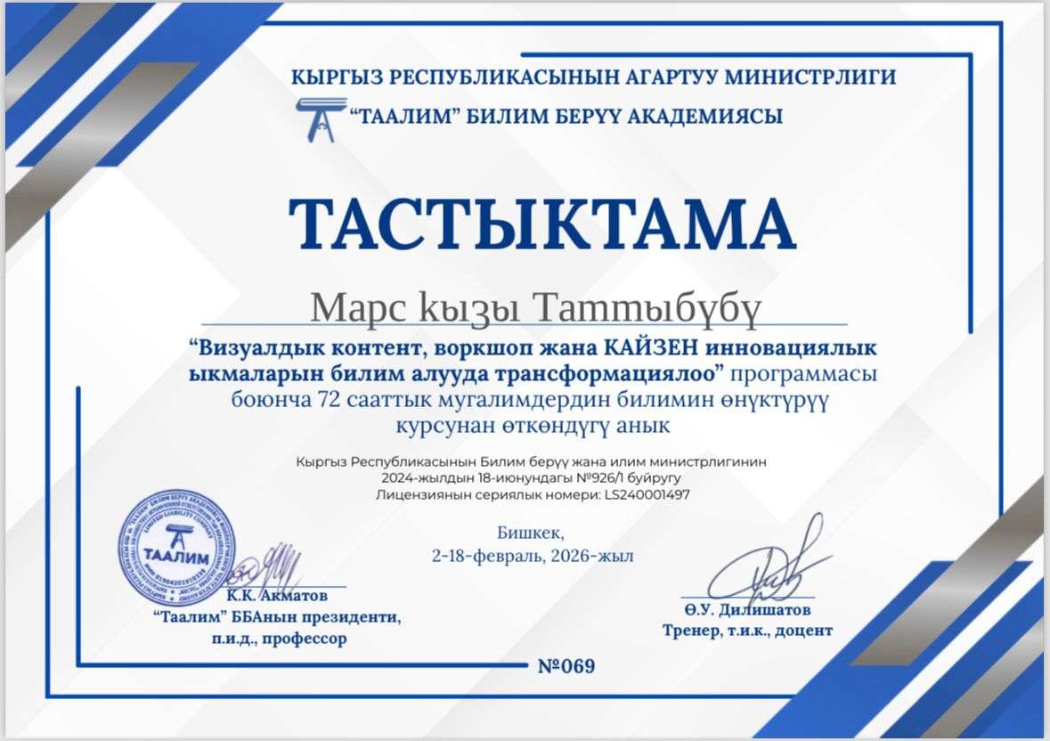 «Визуалдык контентти, воркшопторду жана Кайзен инновациялык ыкмаларын колдонуу аркылуу билим берүү процессин трансформациялоо»
