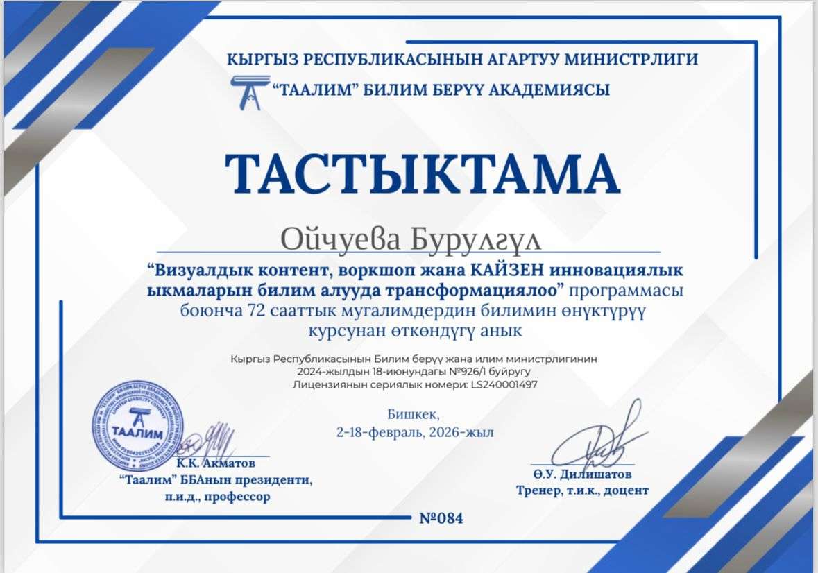 Кыргыз Республикасынын Агартуу министрлиги,«Таалим» билим берүү академиясы менен биргеликте «Визуалдык контентти, воркшопторду жана Кайзен инновациялык ыкмаларын колдонуу аркылуу билим берүү процессин трансформациялоо» темасында 72 сааттык квалификацияны жогорулатуу курсун уюштурду. Доцент Ойчуева Б.Р. жана окутуучулар Таиржанова М.Т., Марс кызы Т. аталган курстан ийгиликтүү өтүп, тиешелүү сертификаттарга ээ болушту.